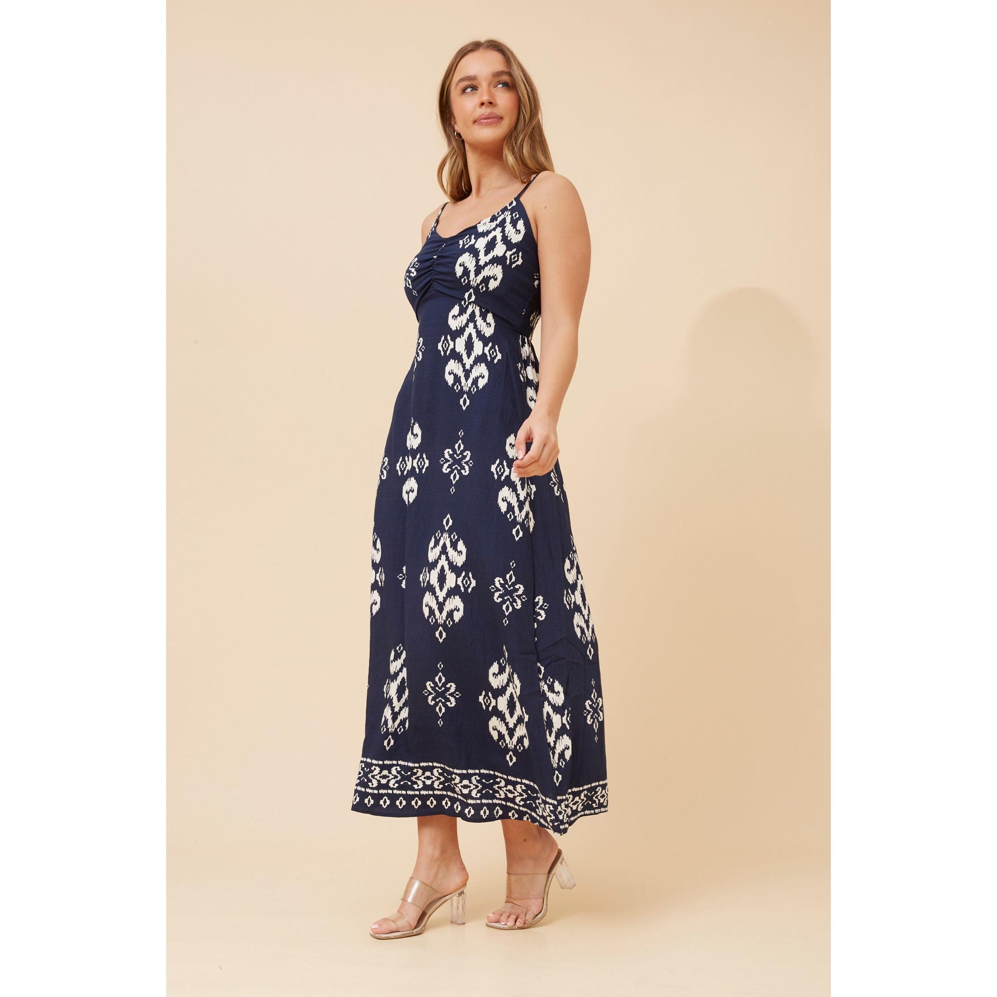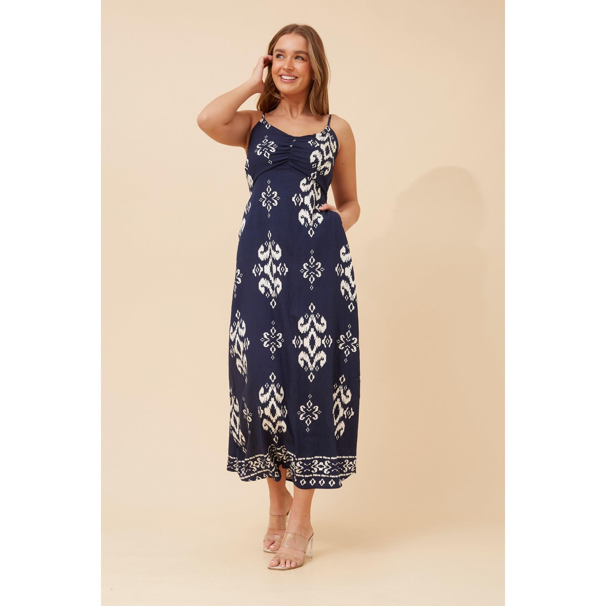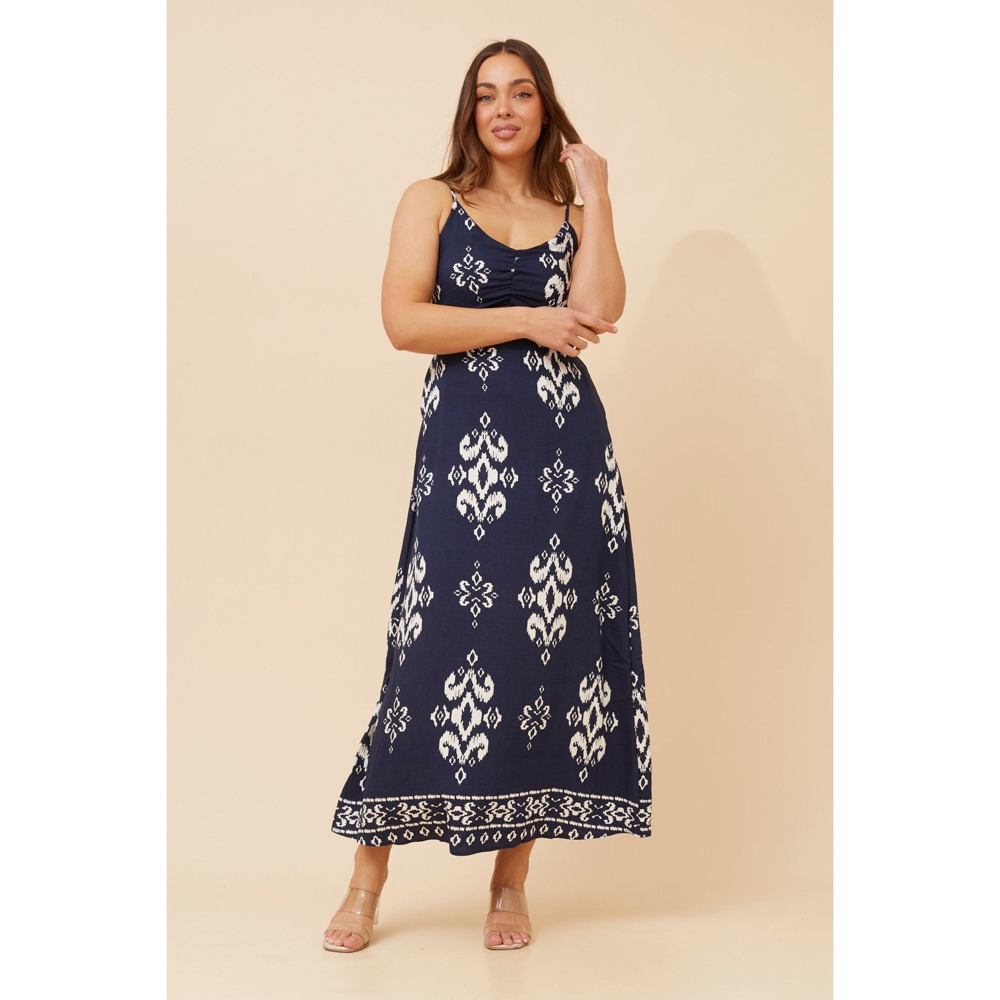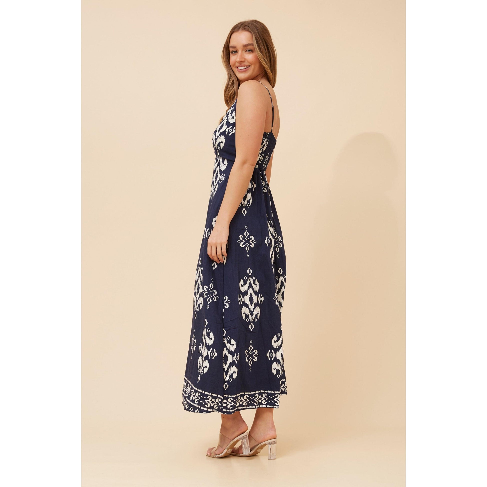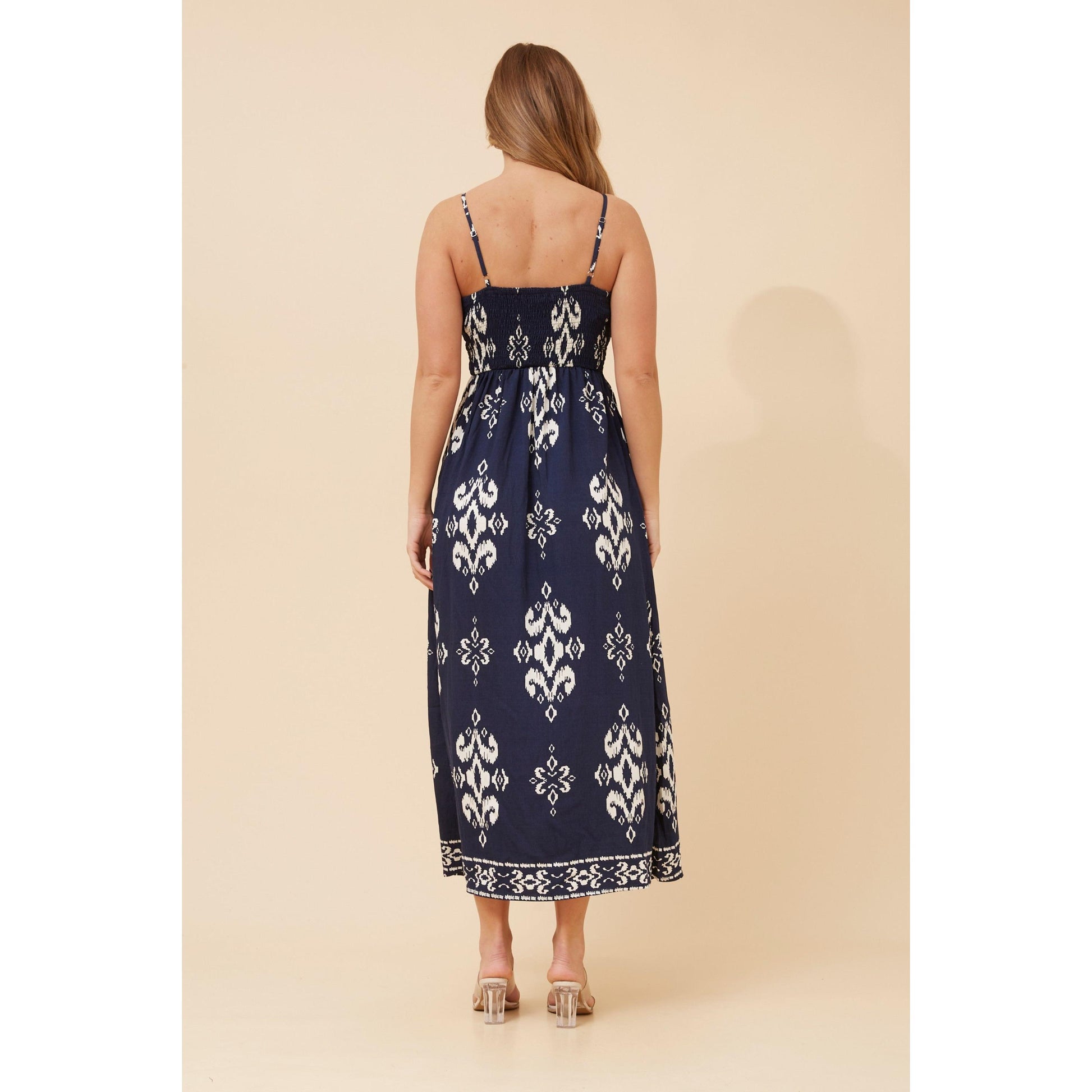 Opt for playful charm with the Becca Dress in Navy print. Pair with sandals and your favourite sunglasses for an easy, holiday-ready look.