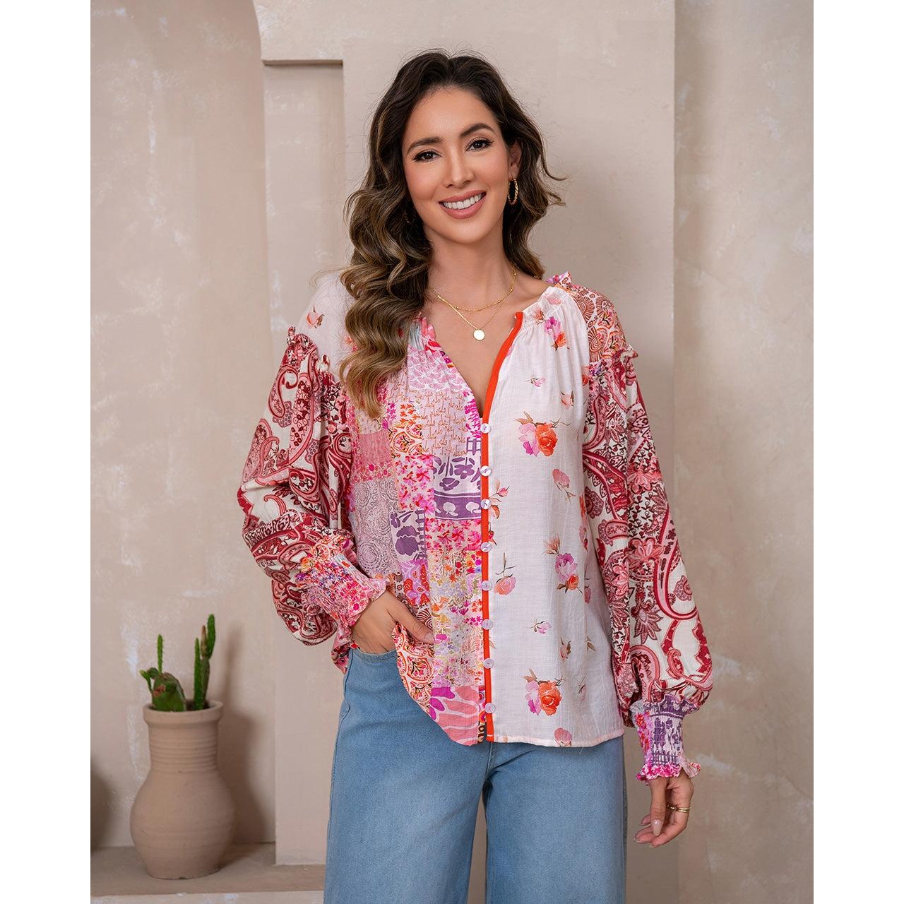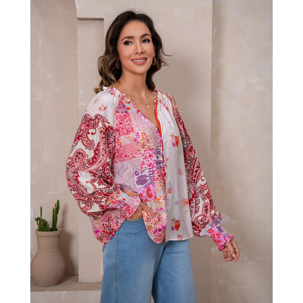 Dive into a kaleidoscope of colors with our Alicia blouse in pink! This playful patchwork design features a gathered neckline and button-up front that adds a touch of whimsy to any outfit. The long balloon sleeves with smocked cuffs create a dramatic silhouette, while the 100% rayon fabric keeps things light and breezy. Perfect for those who love to make a statement while staying comfortably cool!