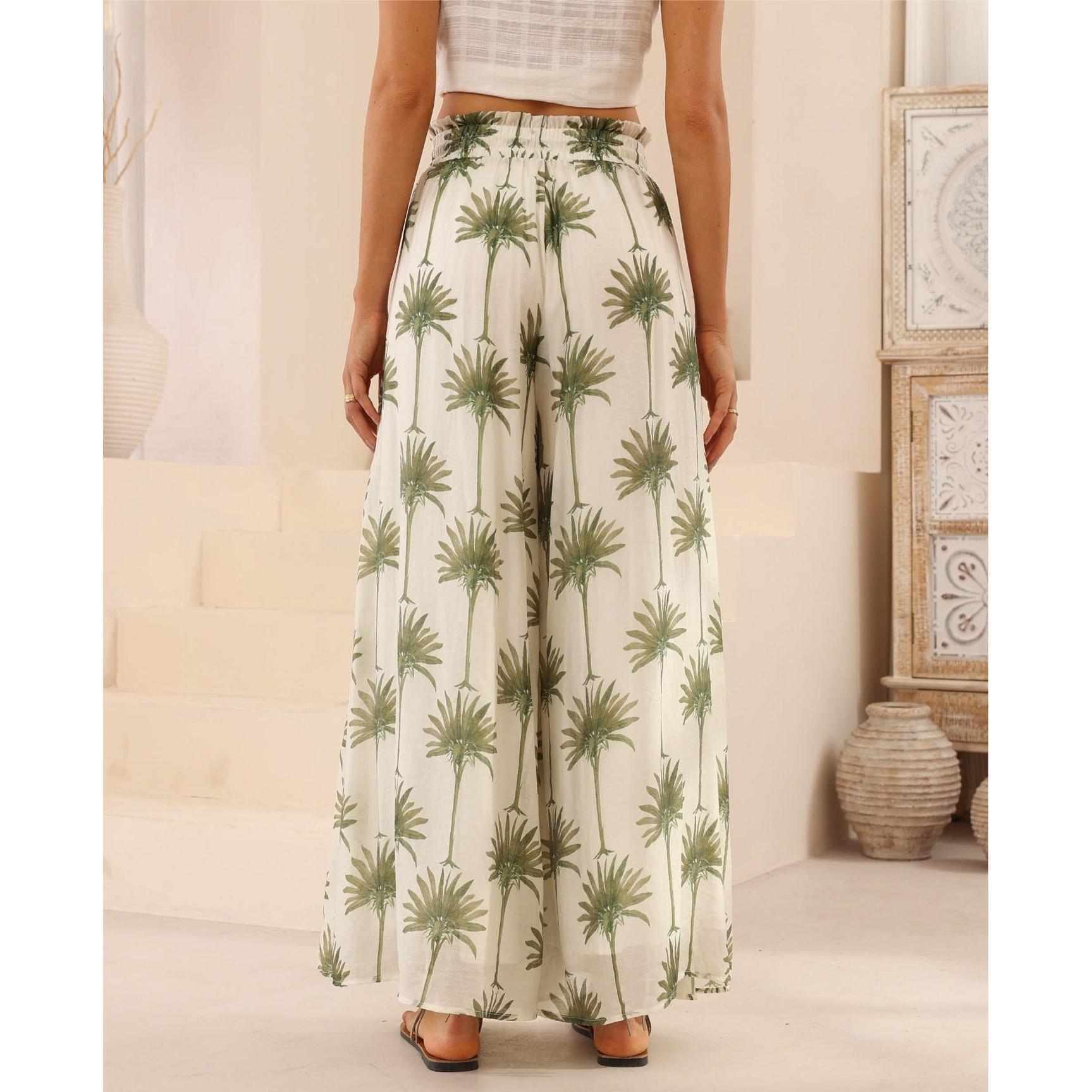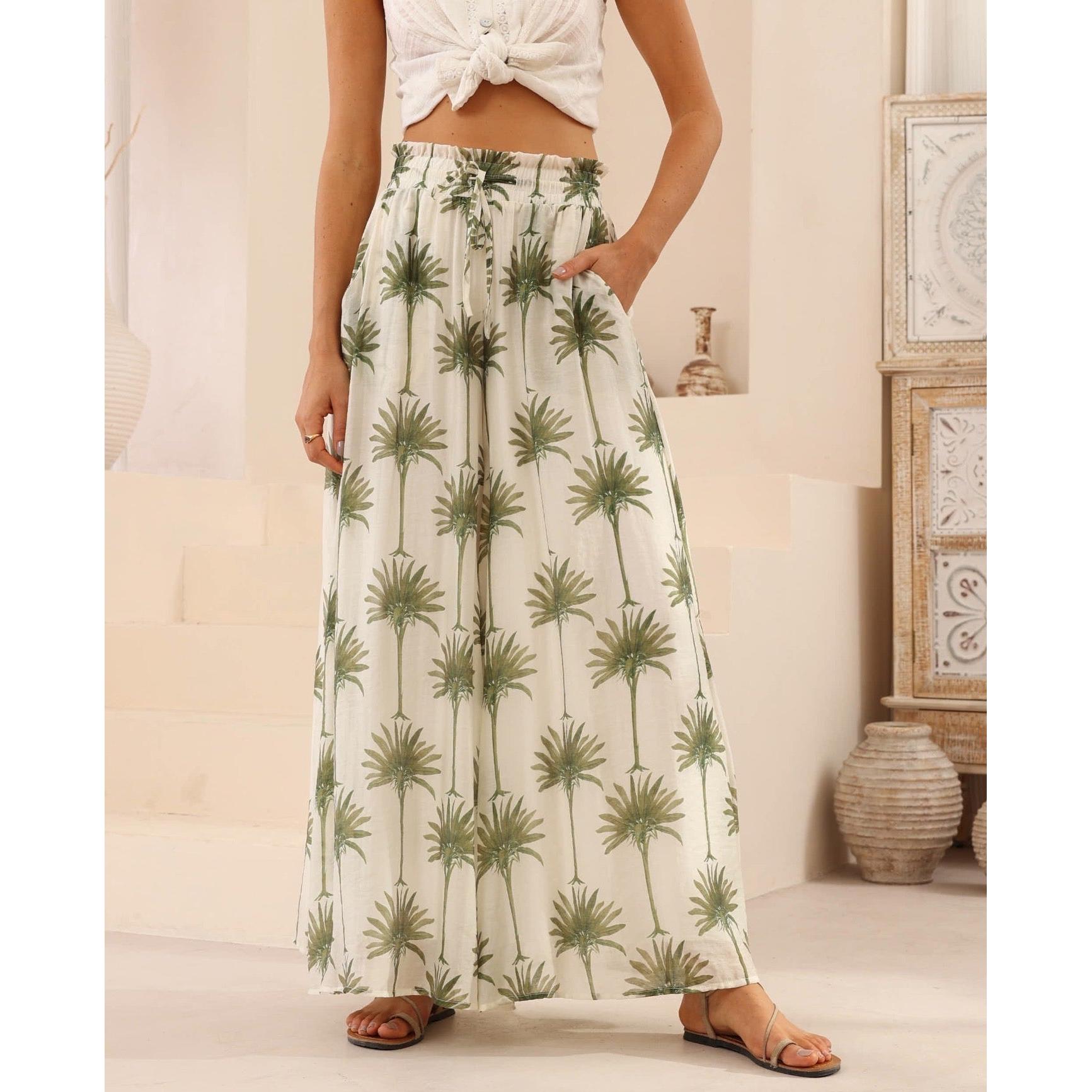 These Angela Pants bring tropical vibes to your wardrobe with their vibrant palm tree print and flowy wide-leg design. Crafted from lightweight, breathable fabric, they feature a comfy elasticised waistband with a drawstring for the perfect fit. Lined for extra comfort and equipped with handy side pockets, these pants are your go-to for effortless style and all-day ease. Perfect for sunny days and playful adventures!