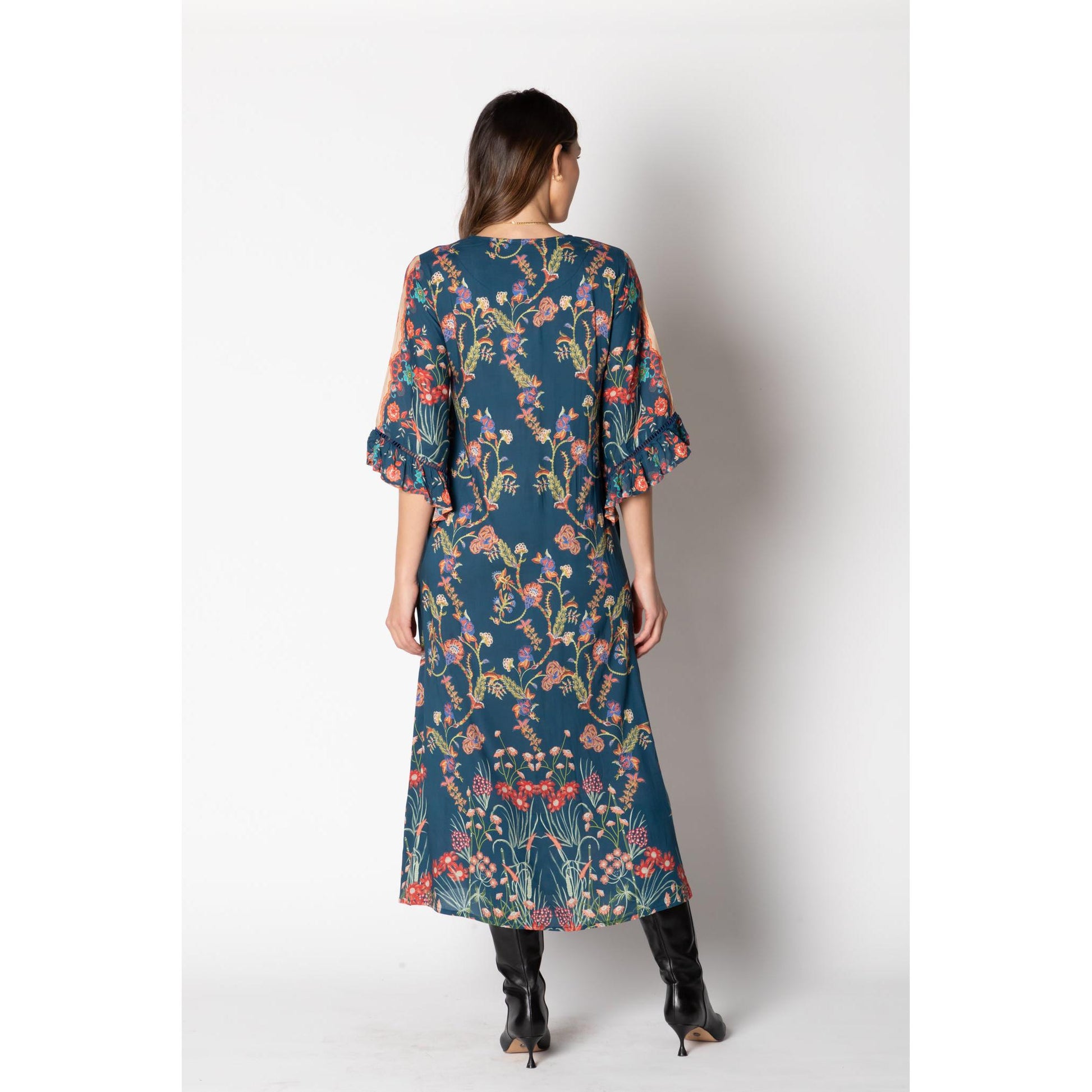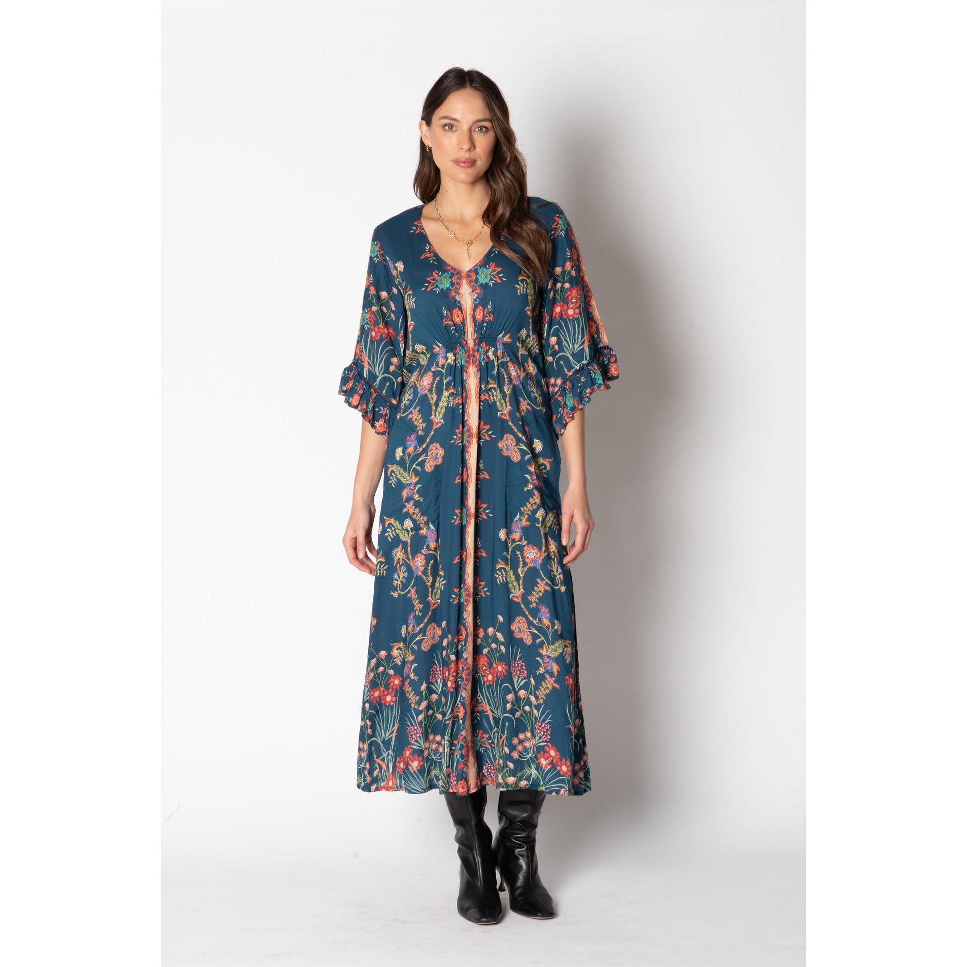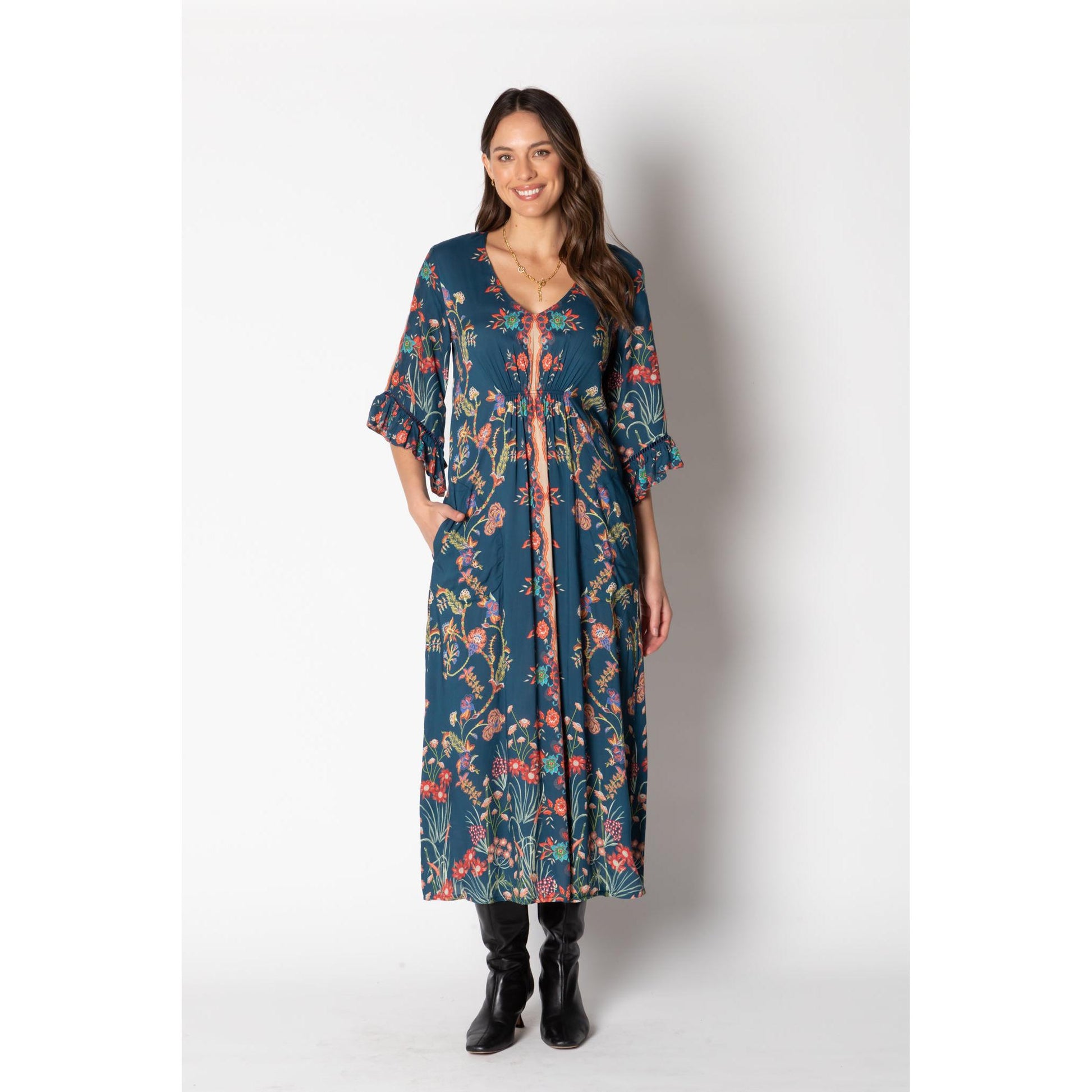 The Barcelona Midi Dress is the perfect addition to your wardrobe. Its lightweight design and 3/4 sleeves with fluted cuffs make it ideal for any season. With a V-neckline, inset side pockets, and intricate beading detailing, this long midi dress combines style and functionality. Designed in Australia, it's a must-have for any fashion-forward individual.