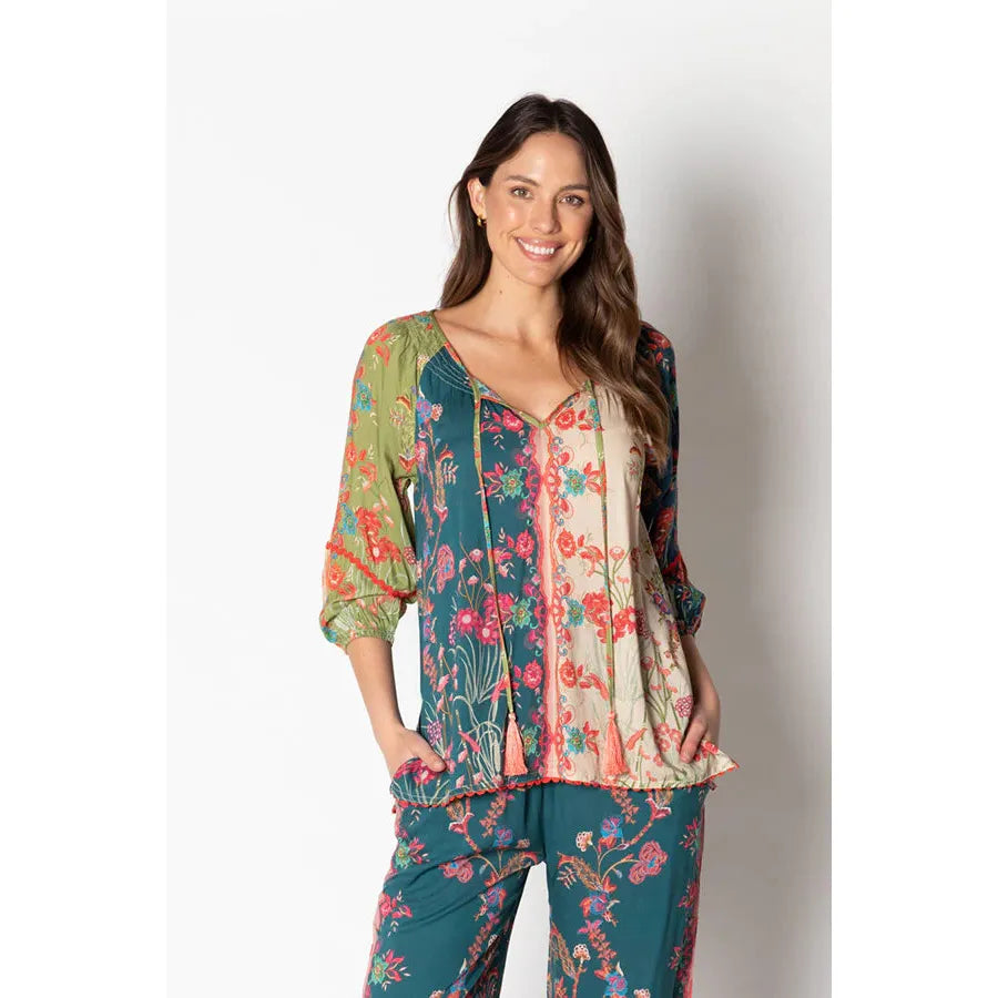 A classic wardrobe staple that will stand the test of time. A smart yet comfortable shape, providing length coverage. The neck has rows of shirring around the neckline and the ties with tassels that can be tied together to create a more modest round neck or open to create a flattering V neck. The ¾ length sleeves provide coverage and practicality with the soft elastic allowing the sleeves to be pushed up for a different look.