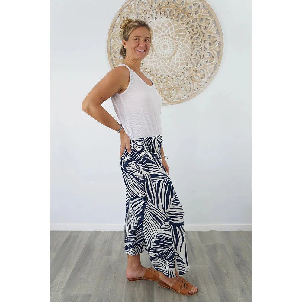 Crafted with a shirring elastic waist, wide leg, and adjustable ties, the 3/4 Bazzar pant in Navy Honiara print is the perfect everyday garment for sizes 10-16.
