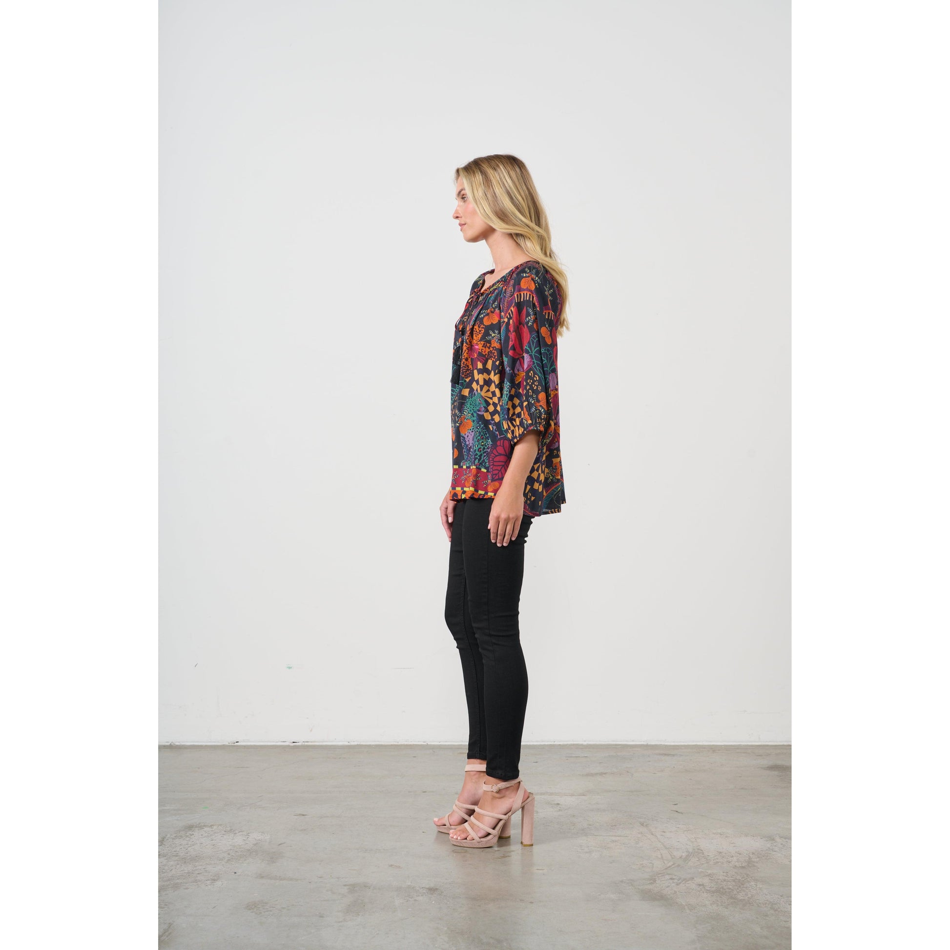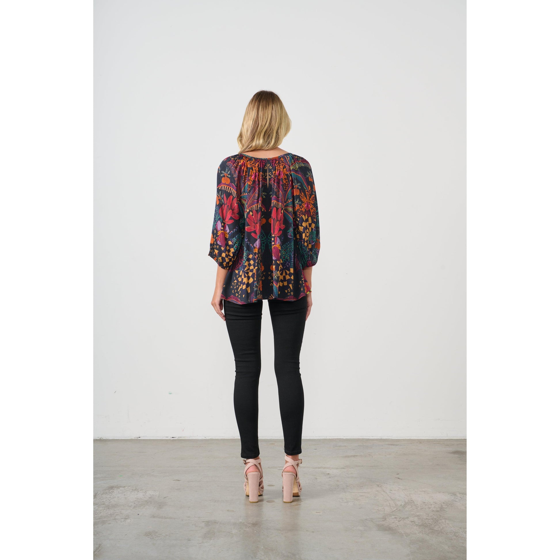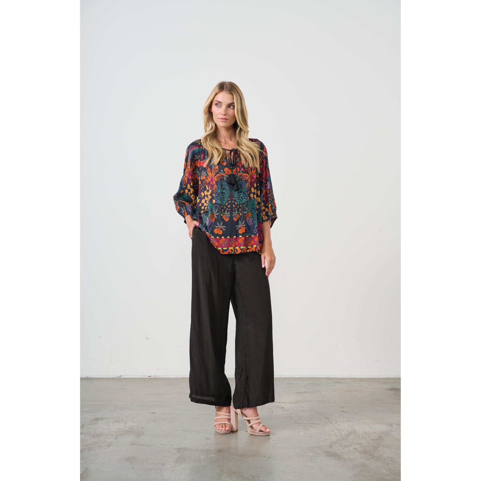 The Carina Top in Black features a round tie-neck design, blending subtle neutral tones with a vibrant, colorful tropical print. This top offers a refined yet lively look, perfect for adding an expert touch to your casual or semi-formal wardrobe. The tie neck detail elevates the silhouette while ensuring comfortable wear throughout the day.