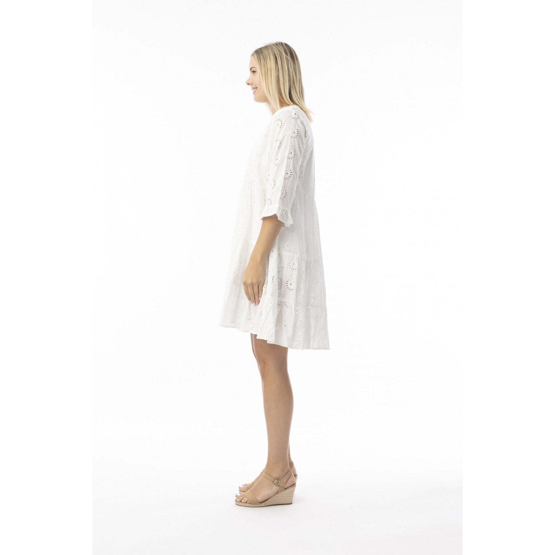 Add timeless charm to your wardrobe with the Broderie Essentials Dress — a beautifully crafted knee-length piece that blends delicate details with effortless style. Featuring intricate broderie anglaise fabric, this dress is designed with feminine frill accents on the hem and sleeves for a soft, romantic finish.A refined mandarin collar and classic button-up front lend structure and versatility, making it perfect for both day and evening wear. Whether you're heading to brunch, a garden party, or just want to elevate your everyday look, this dress offers a flattering, polished silhouette with breathable comfort.
