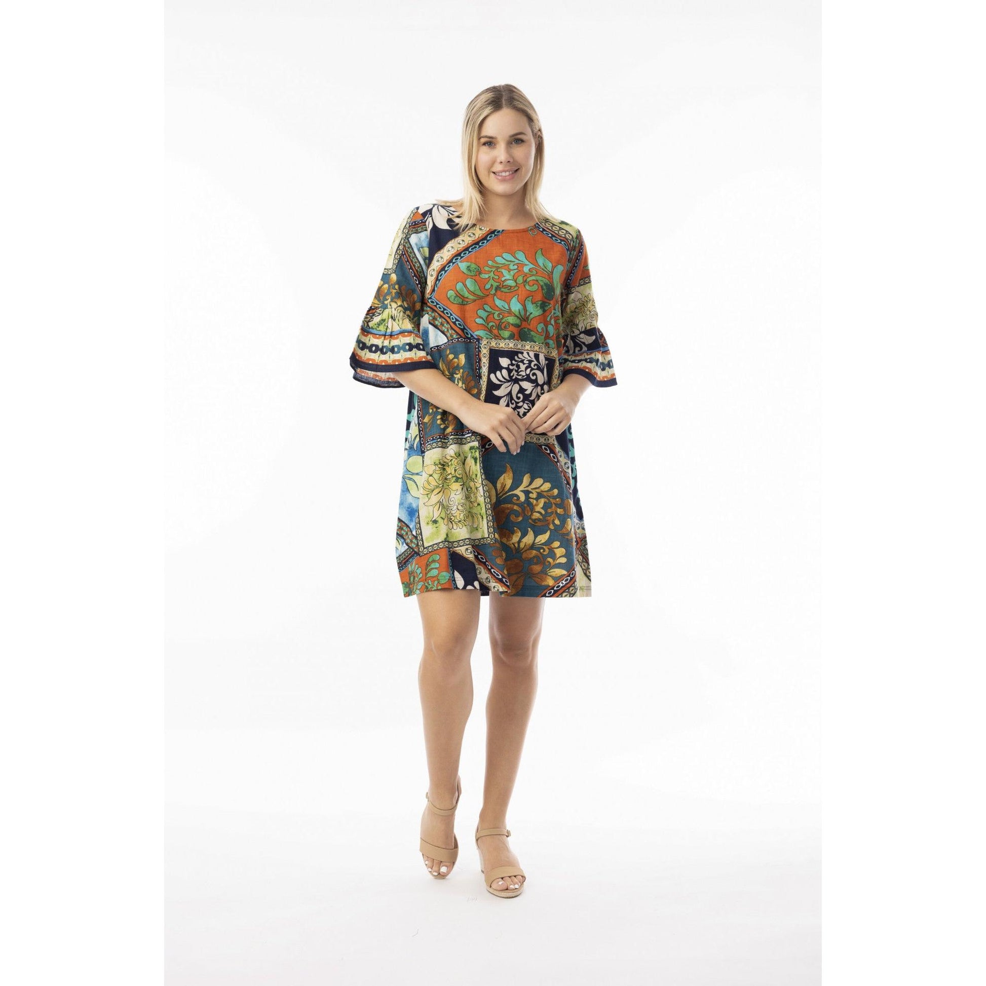 Enjoy chic comfort with our relaxed Cabo Fria contemporary dress. Featuring a relaxed fit and elbow-length sleeves, this dress showcases beautiful, colourful patterns creating a unique and eye-catching design. Perfect for any casual outing, it offers both style and comfort, ensuring you look effortlessly chic all day.