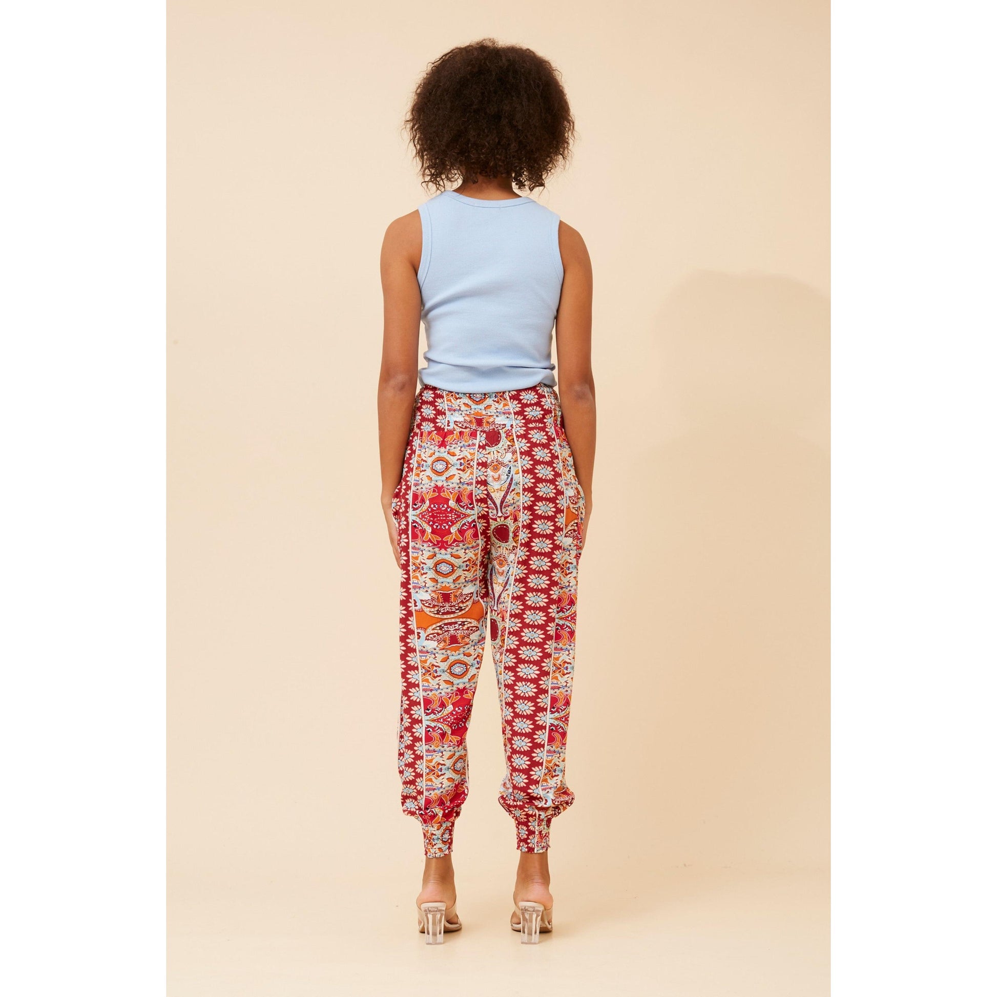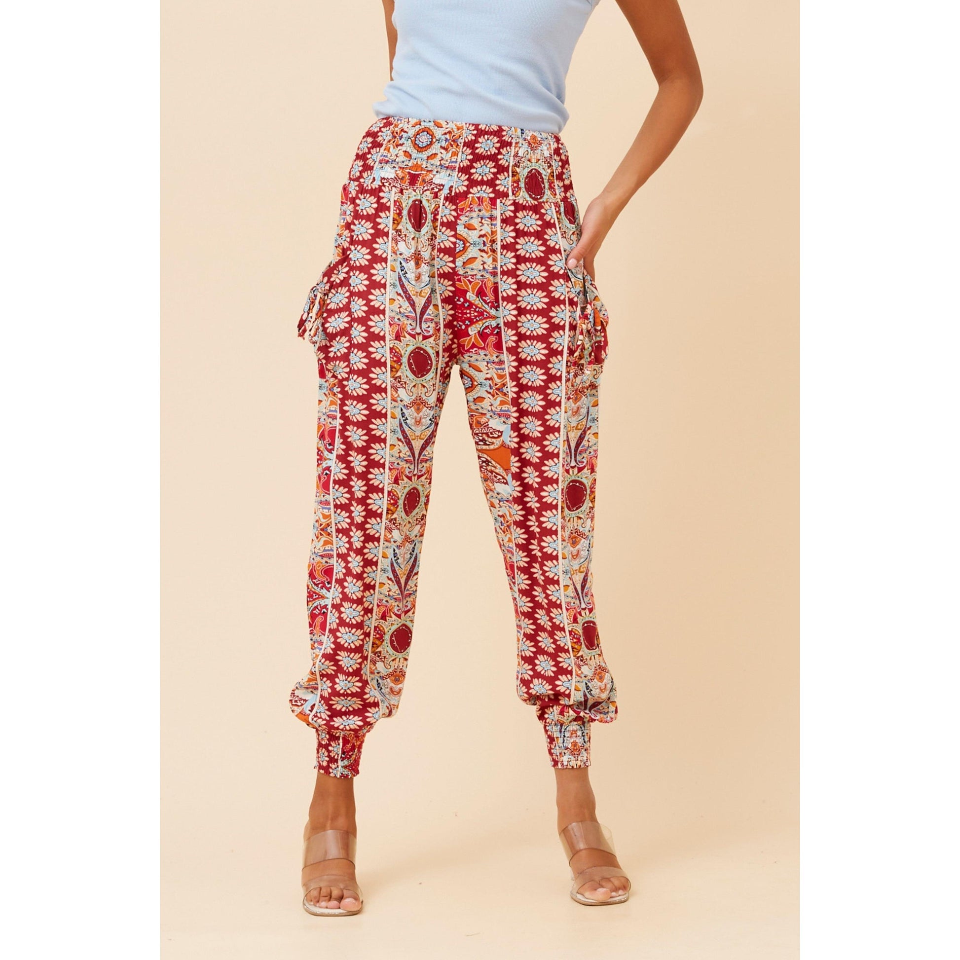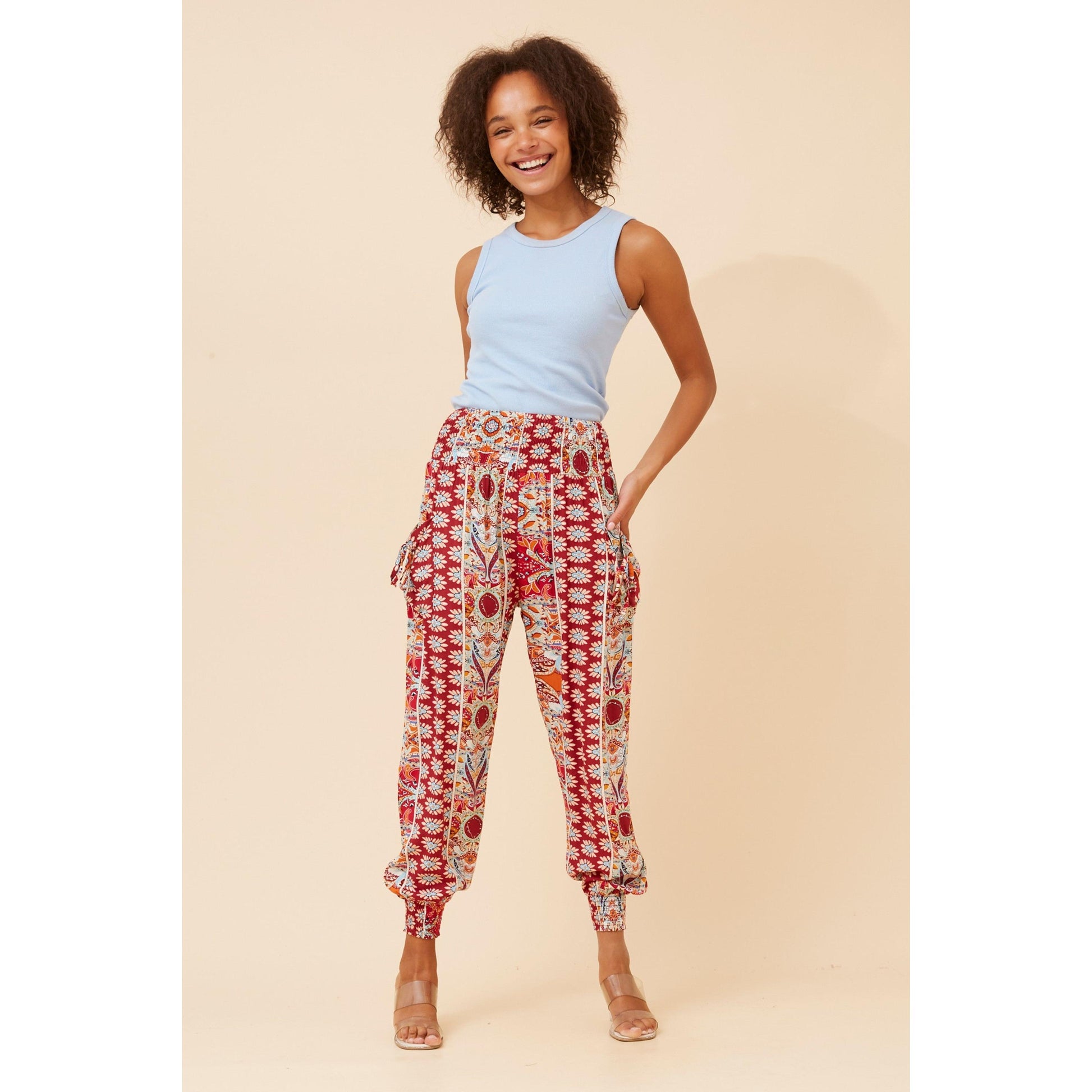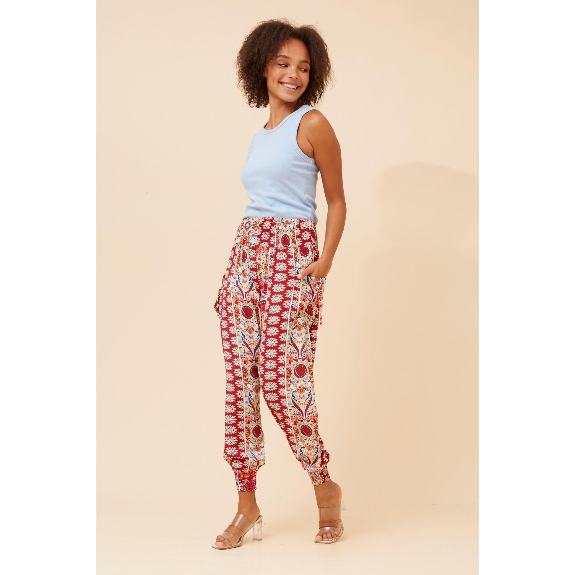 These stylish harem pants are a must have piece for summer styling. A shirred waistband ensures comfortable all-day wear. Elasticated leg cuffs create further shaping for that classic harem look. Easy to style with a fitted crop top or tucked in boxy T-shirt.