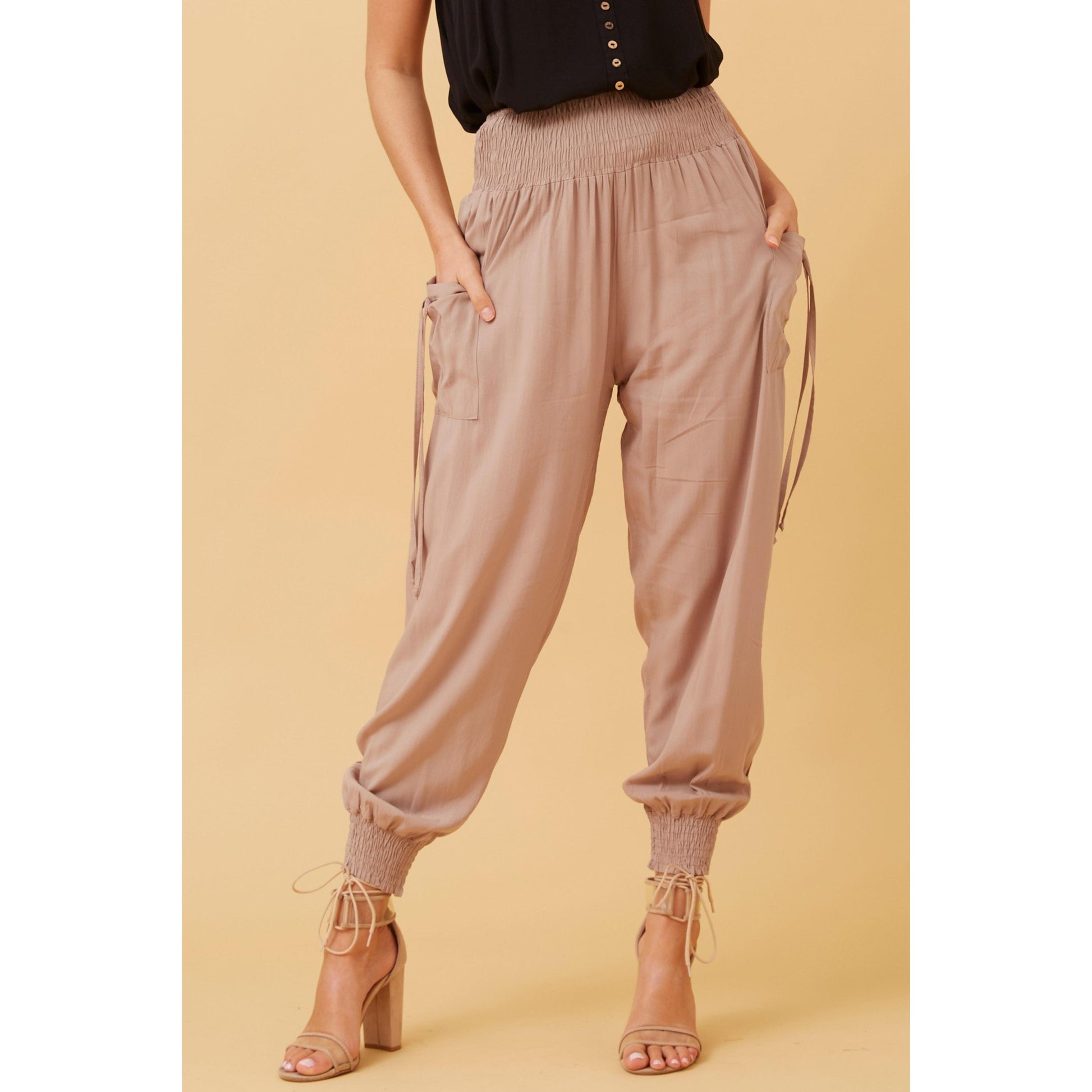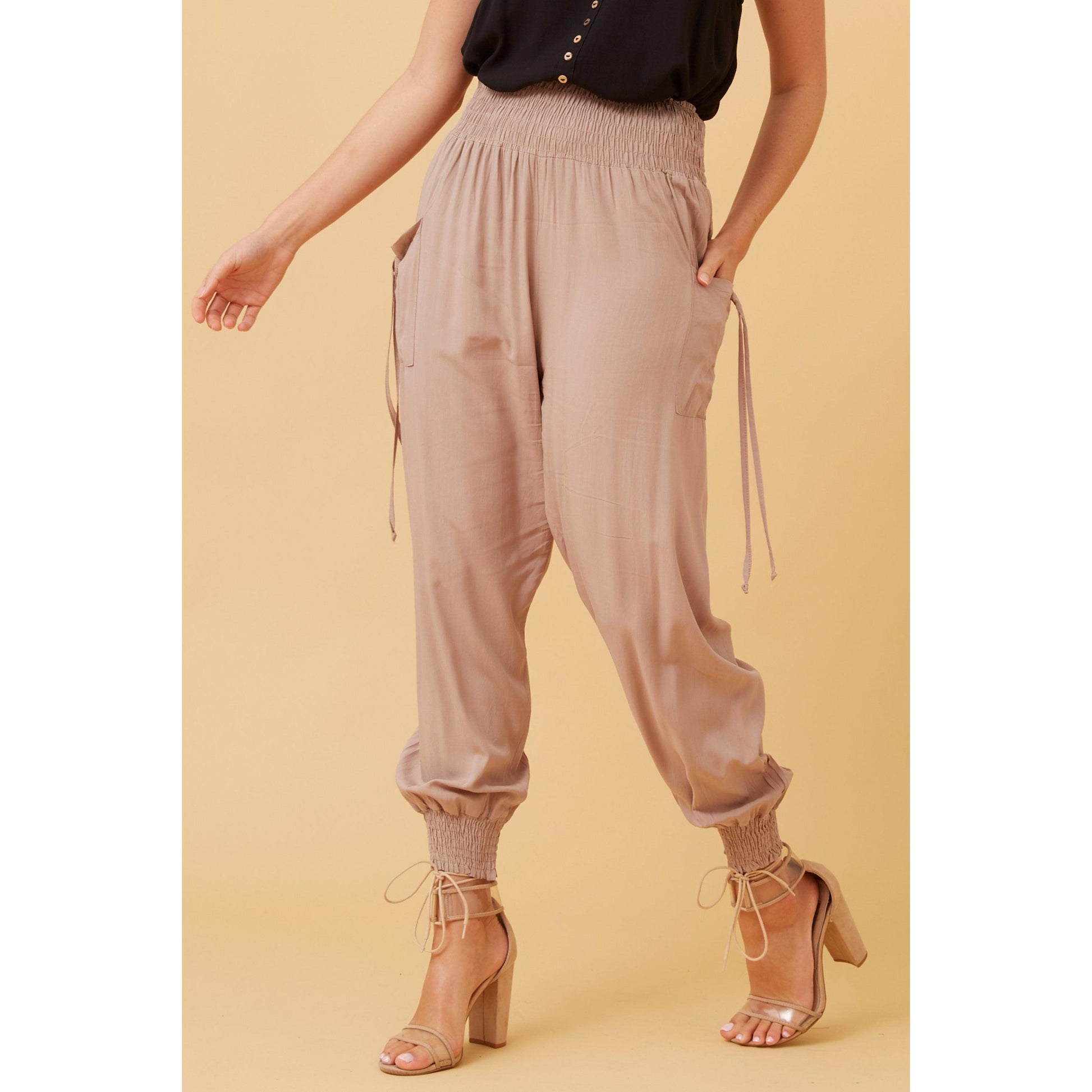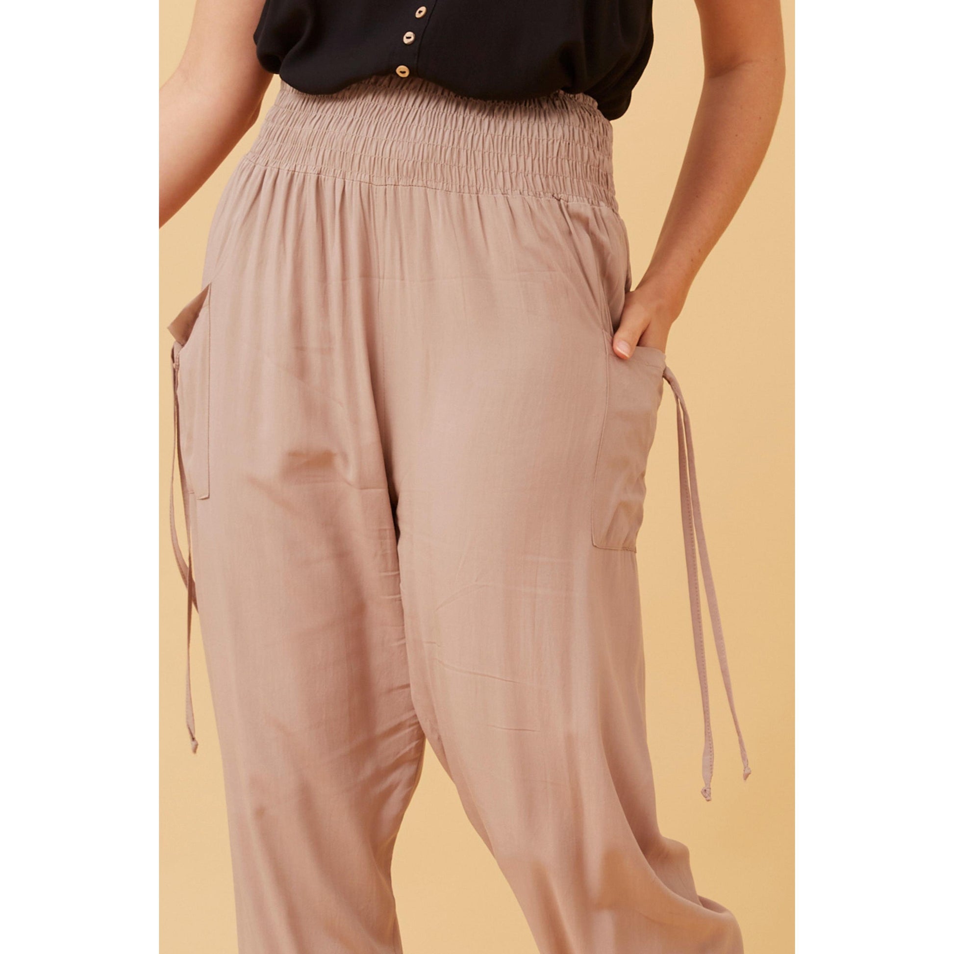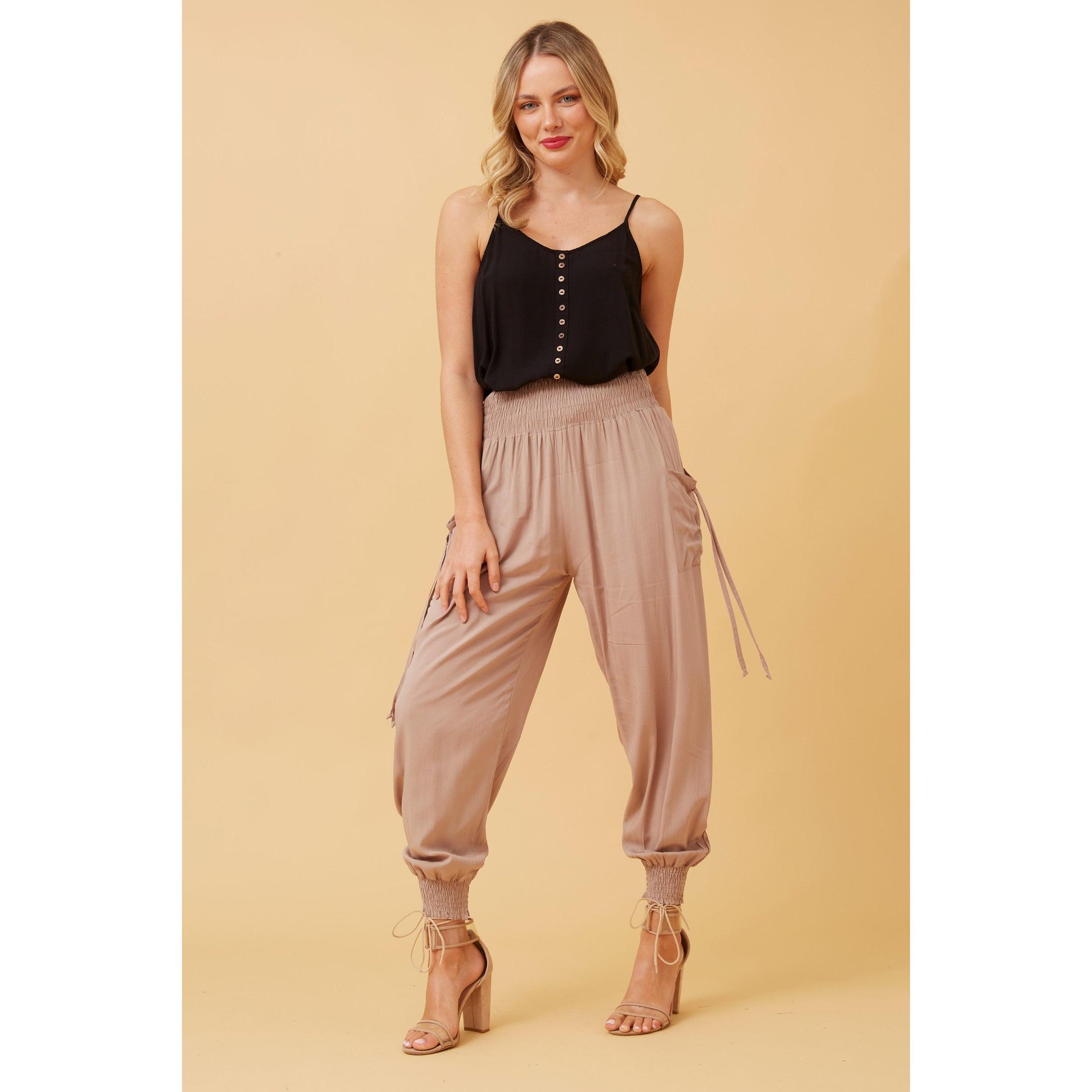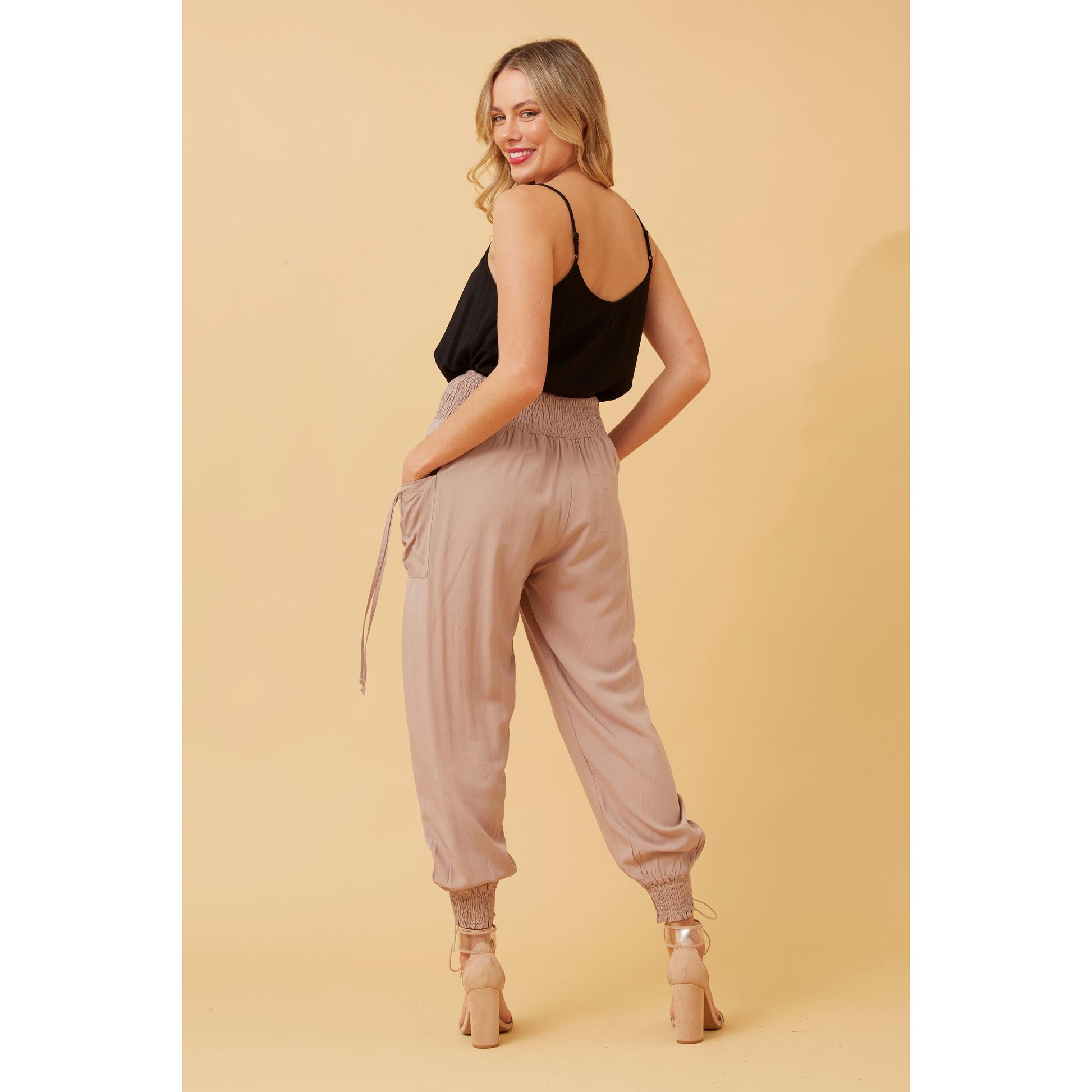These stylish harem pants are a must have piece for summer styling. A shirred waistband ensures comfortable all-day wear. Elasticated leg cuffs create further shaping for that classic harem look. Easy to style with a fitted crop top or tucked in boxy T-shirt. A slimmer fit in the leg to our Sara Harems
