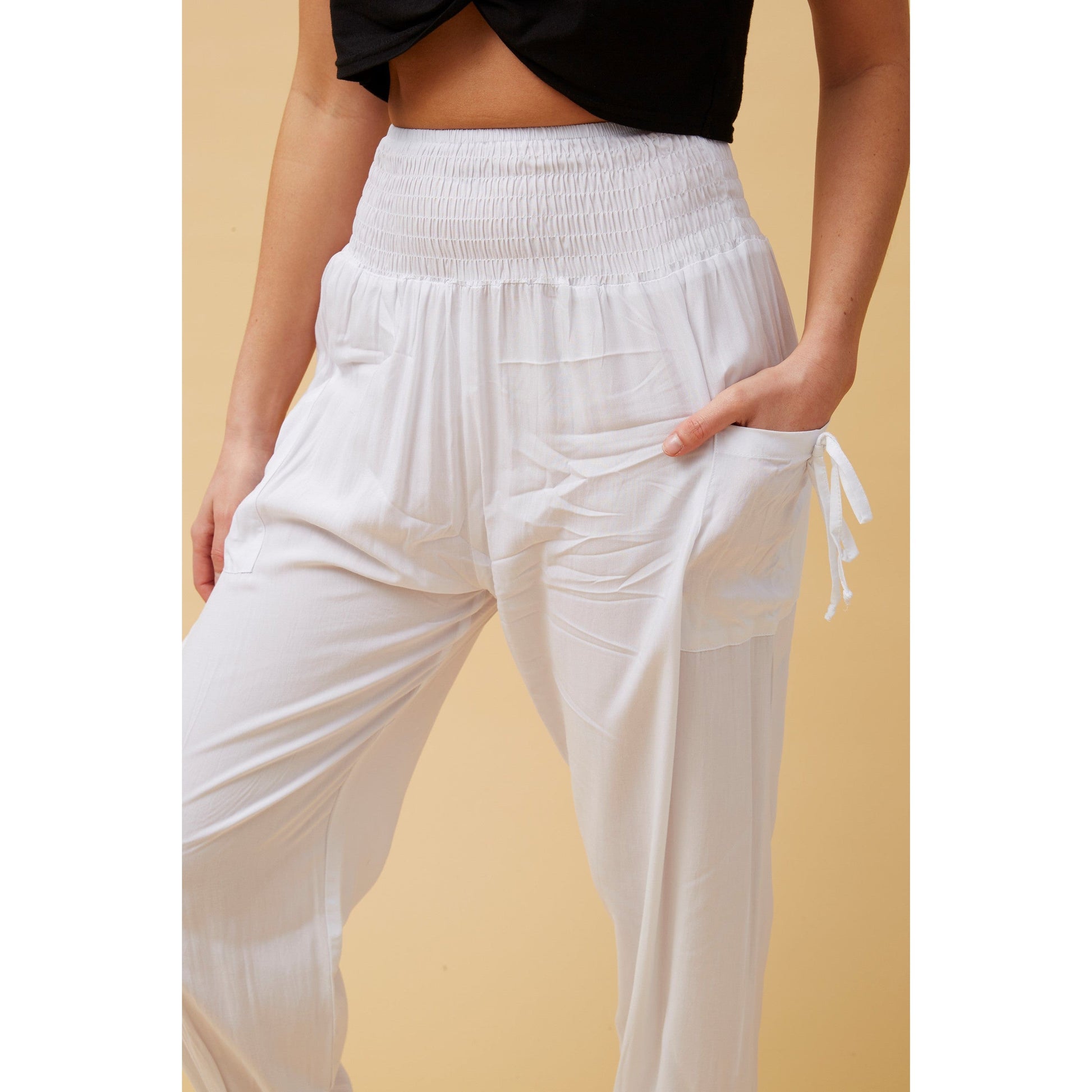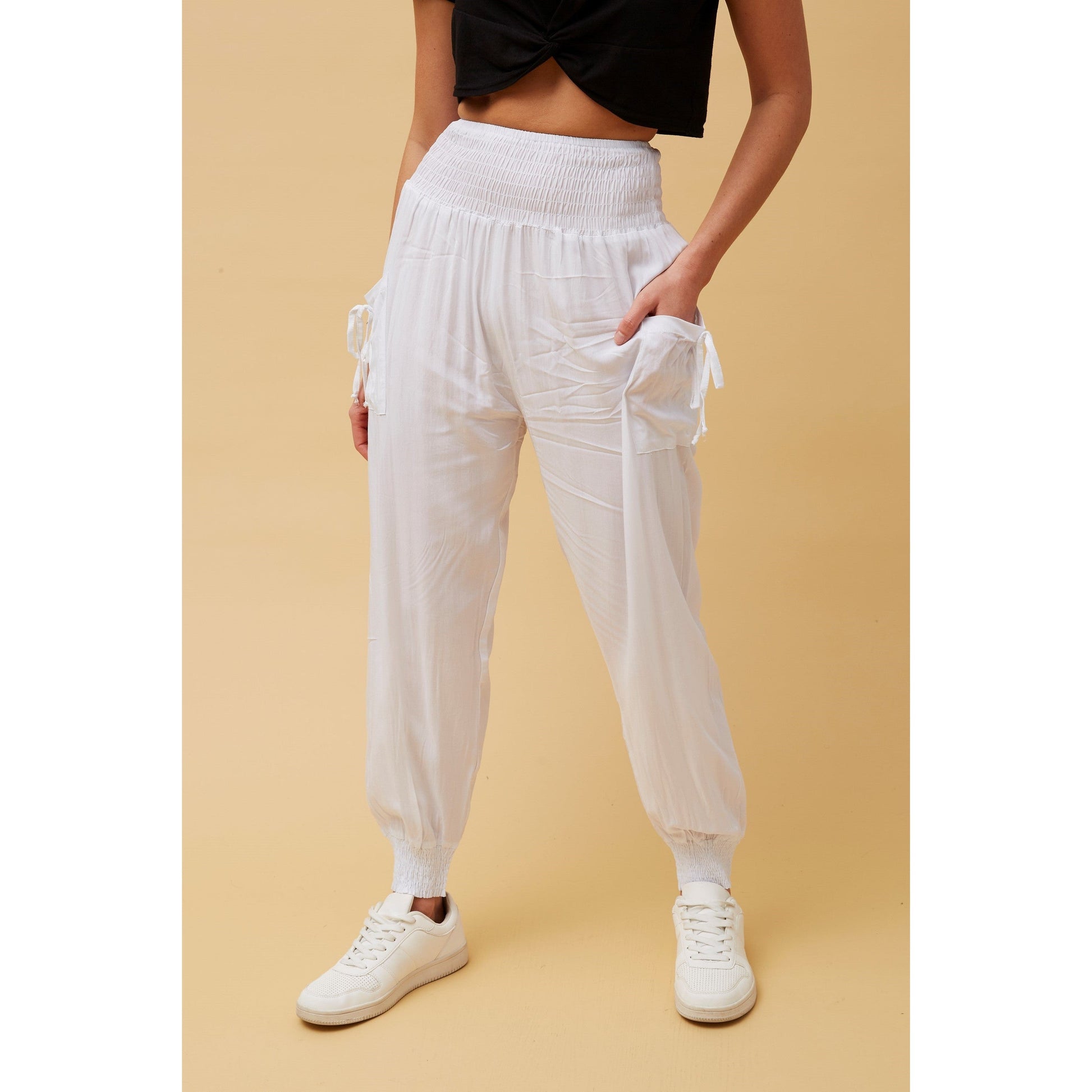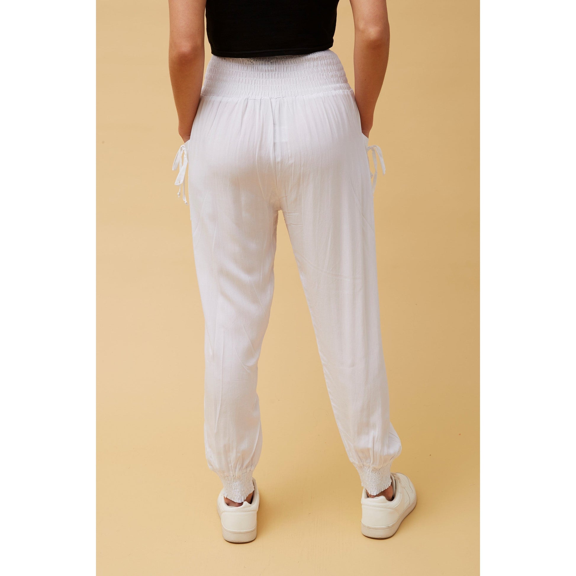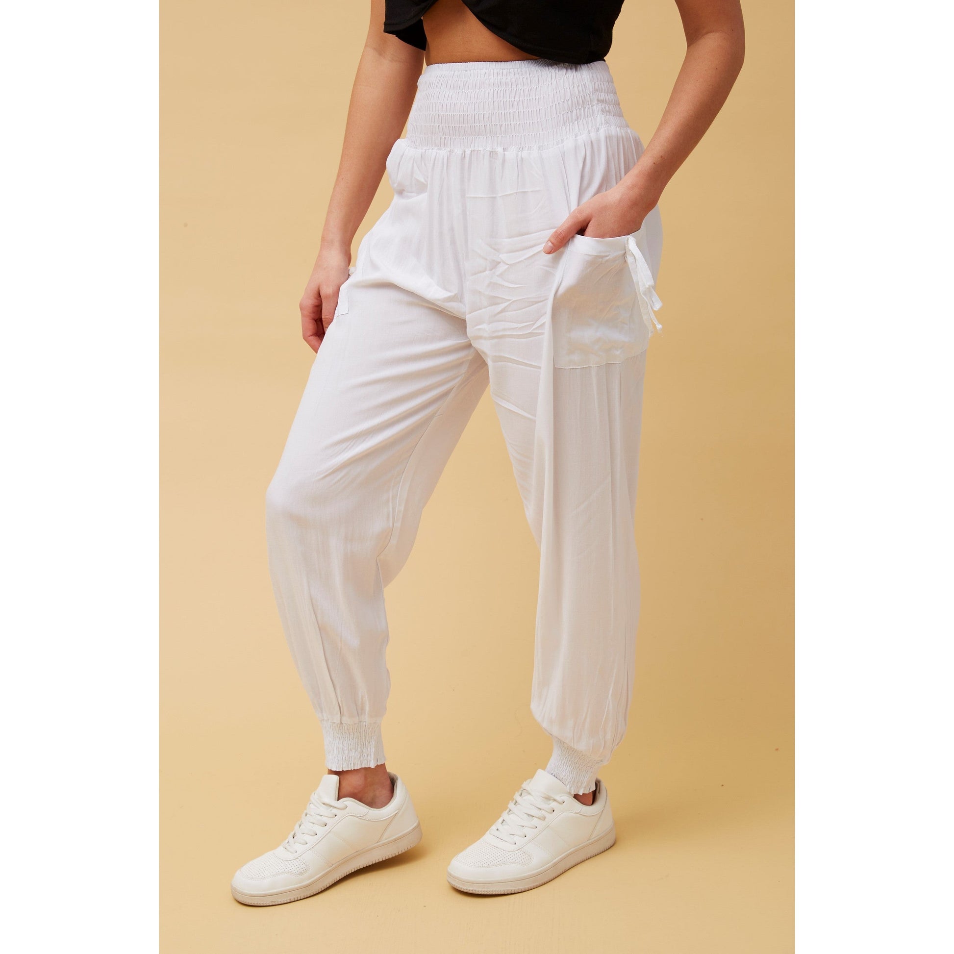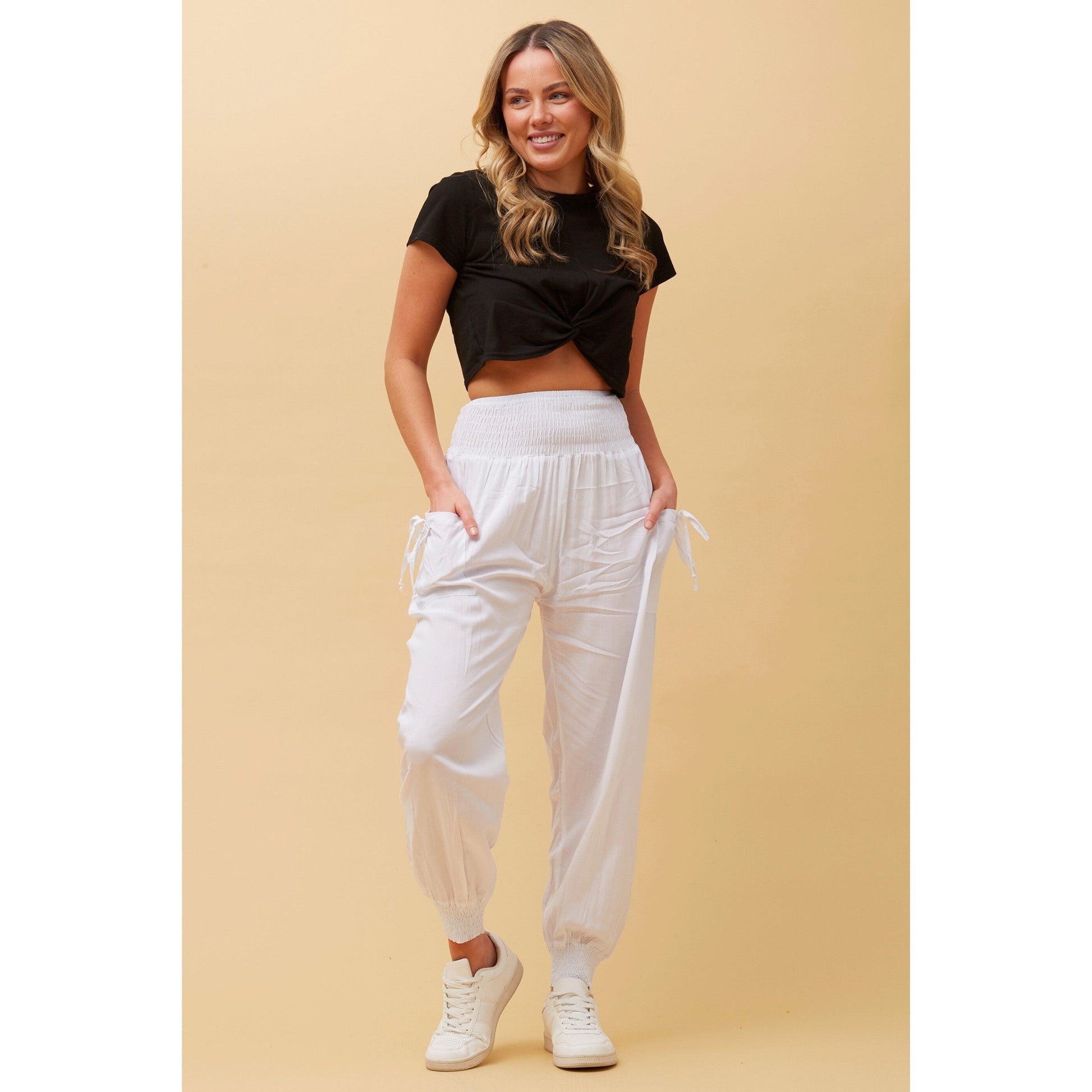 These stylish harem pants are a must have piece for summer styling. A shirred waistband ensures comfortable all-day wear. Elasticated leg cuffs create further shaping for that classic harem look. Easy to style with a fitted crop top or tucked in boxy T-shirt. A slimmer fit in the leg to our Sara Harems