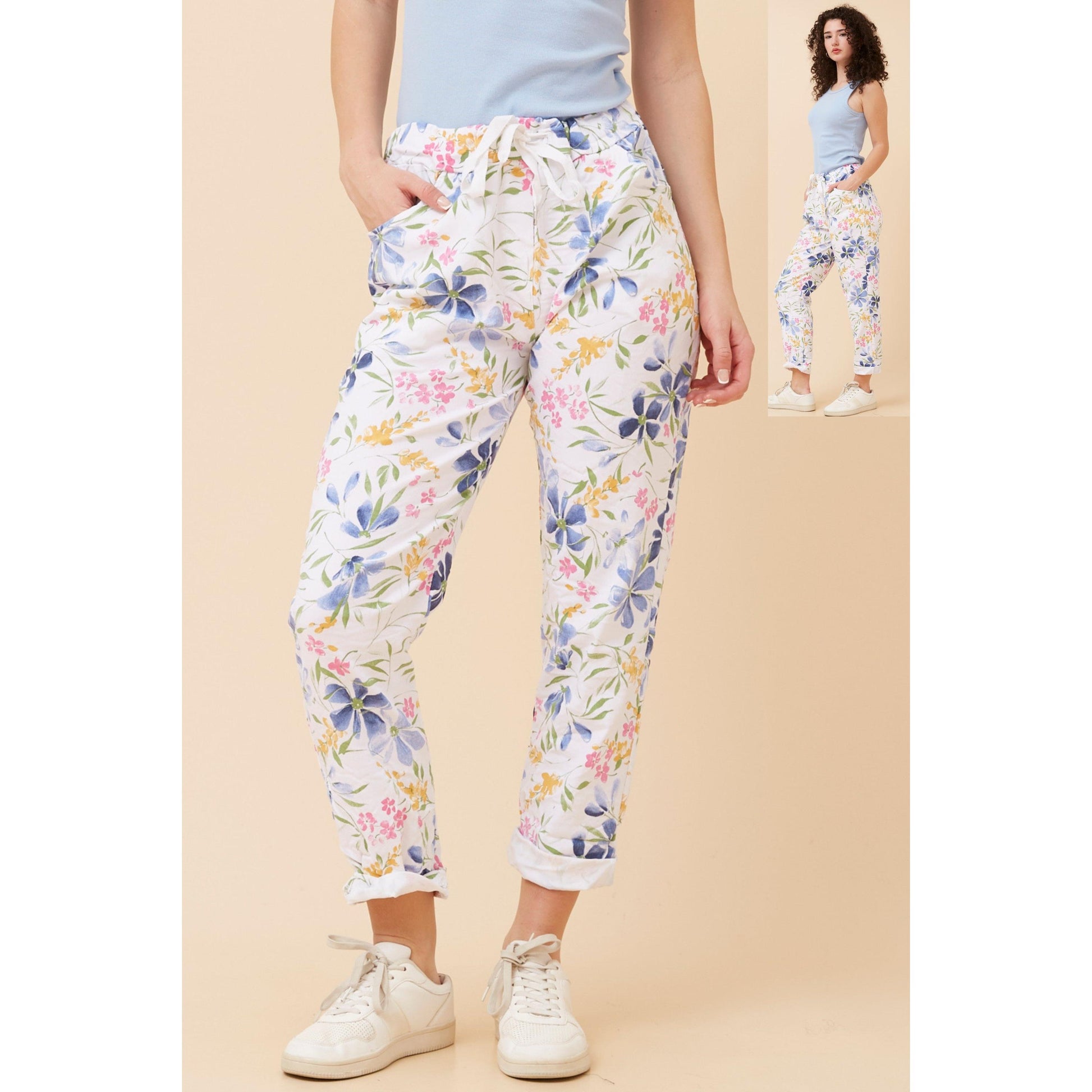 Our fabulous Christine stretch jogger pants are available now in the new White floral print, dress these up with a sandal or wear casual with a jogger, the ultimate for style & comfort! A drawstring waist and functional pockets these are the PERFECT pants for every wardrobe. Please size down these are a roomy stretch pant