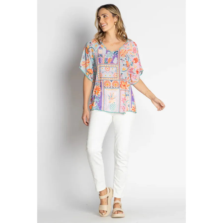 The Zorana Top is a relaxed-fit, lightweight top crafted from 100% viscose and designed in Australia. Featuring a flattering V-neck and wide raglan sleeves to the elbow, it offers comfort and effortless style. Ric-rac braid trim on the hems adds playful detail, while mix-and-match patchwork digital prints bring vibrant, eye-catching character. Perfect for pairing with jeans, skirts, or shorts, this top is ideal for casual outings, summer days, or holiday wear.