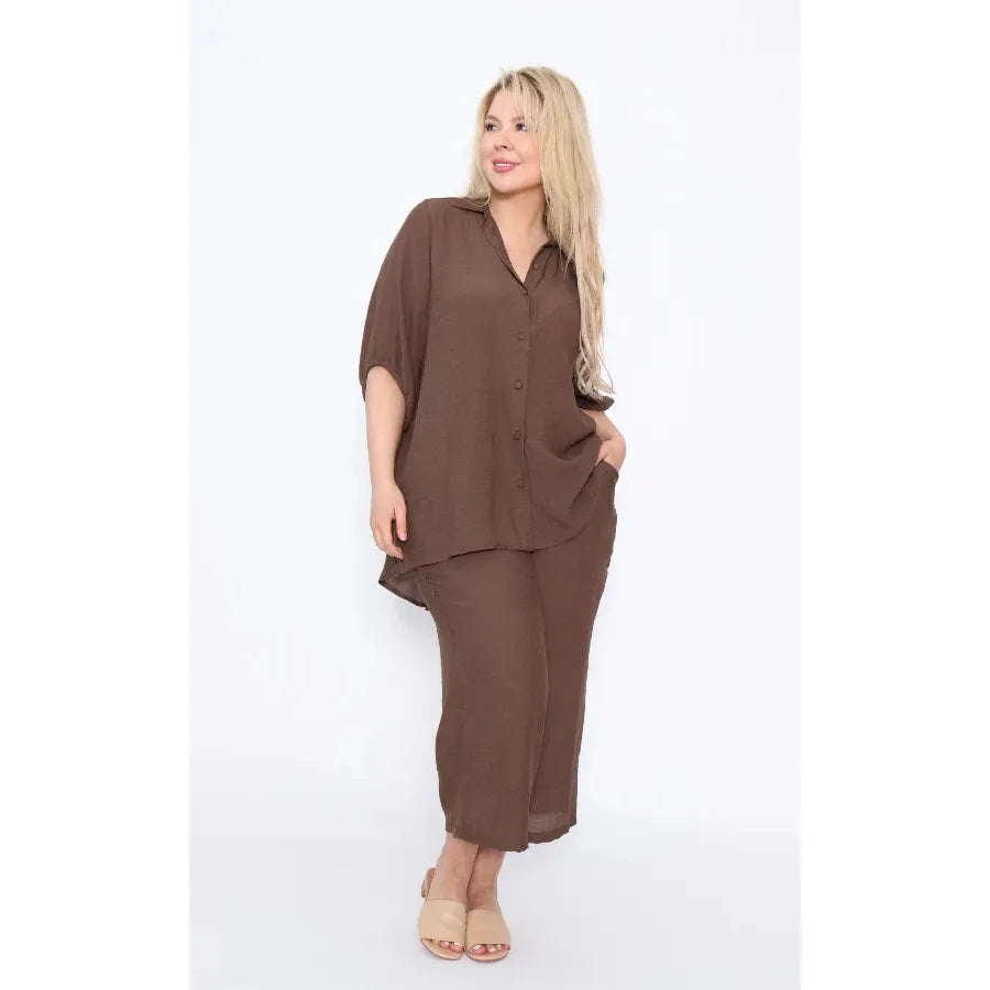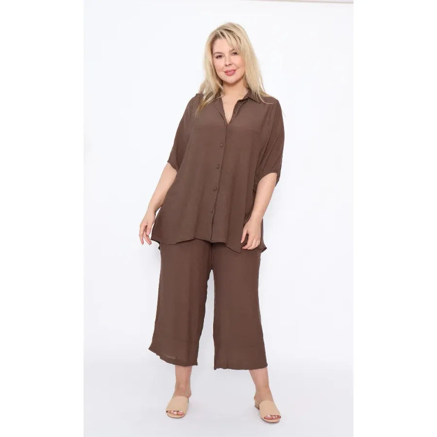 The oversized button-up shirt features a classic collar, flowing silhouette, and relaxed sleeves that create an easy, stylish shape. Paired with matching wide-leg pants, this set delivers a coordinated look that is both flattering and incredibly comfortable.