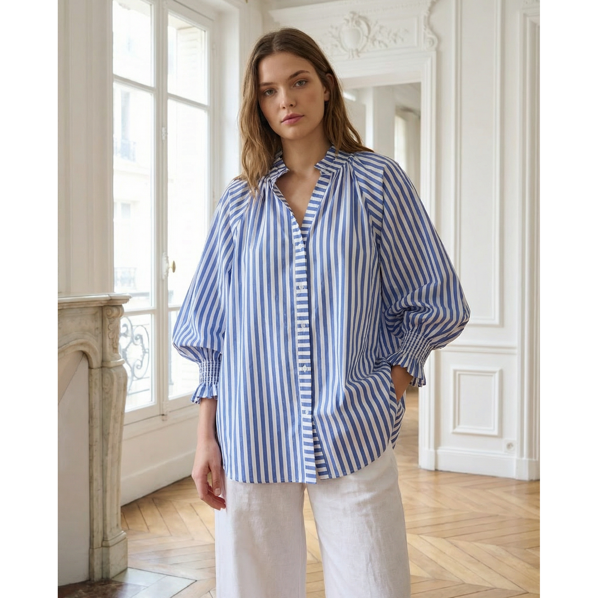 Our new Debbie shirt is an easy-fit shirt, that is beautifully textured and made from breathable natural fibers. This style offers a flattering v neck, button down front and a great sleeve with elastic cuff (perfect coverage for the arms).