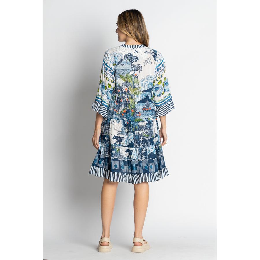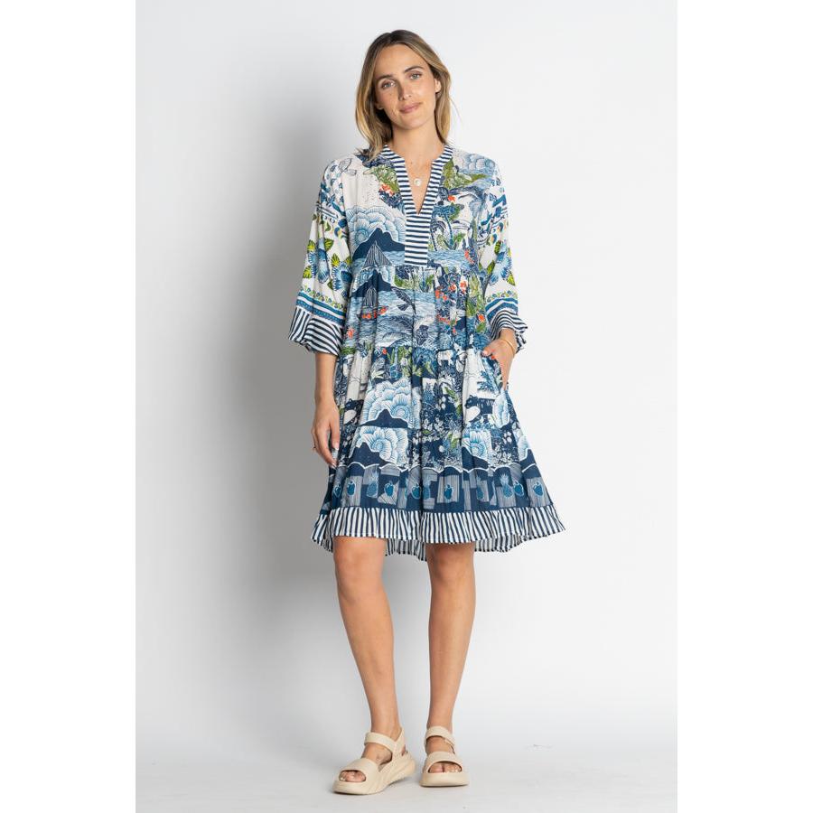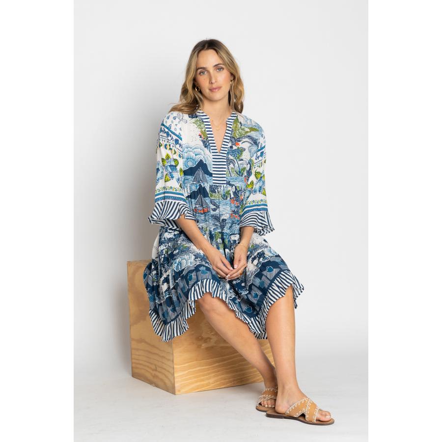 Enjoy effortless style with the Dita dress in our gorgeous Ocean print, featuring a relaxed fit and flattering V-neck with a neckband for added comfort. Its tiered, gathered design and ruffled ¾ length sleeves create a breezy, feminine silhouette. Practical side pockets and knee-length cut make this dress perfect for day-to-night wear. Crafted from 100% viscose with vibrant digital prints, it’s lightweight and breathable. Proudly designed in Australia, the Dita - Ocean dress blends comfort and elegance for your wardrobe.