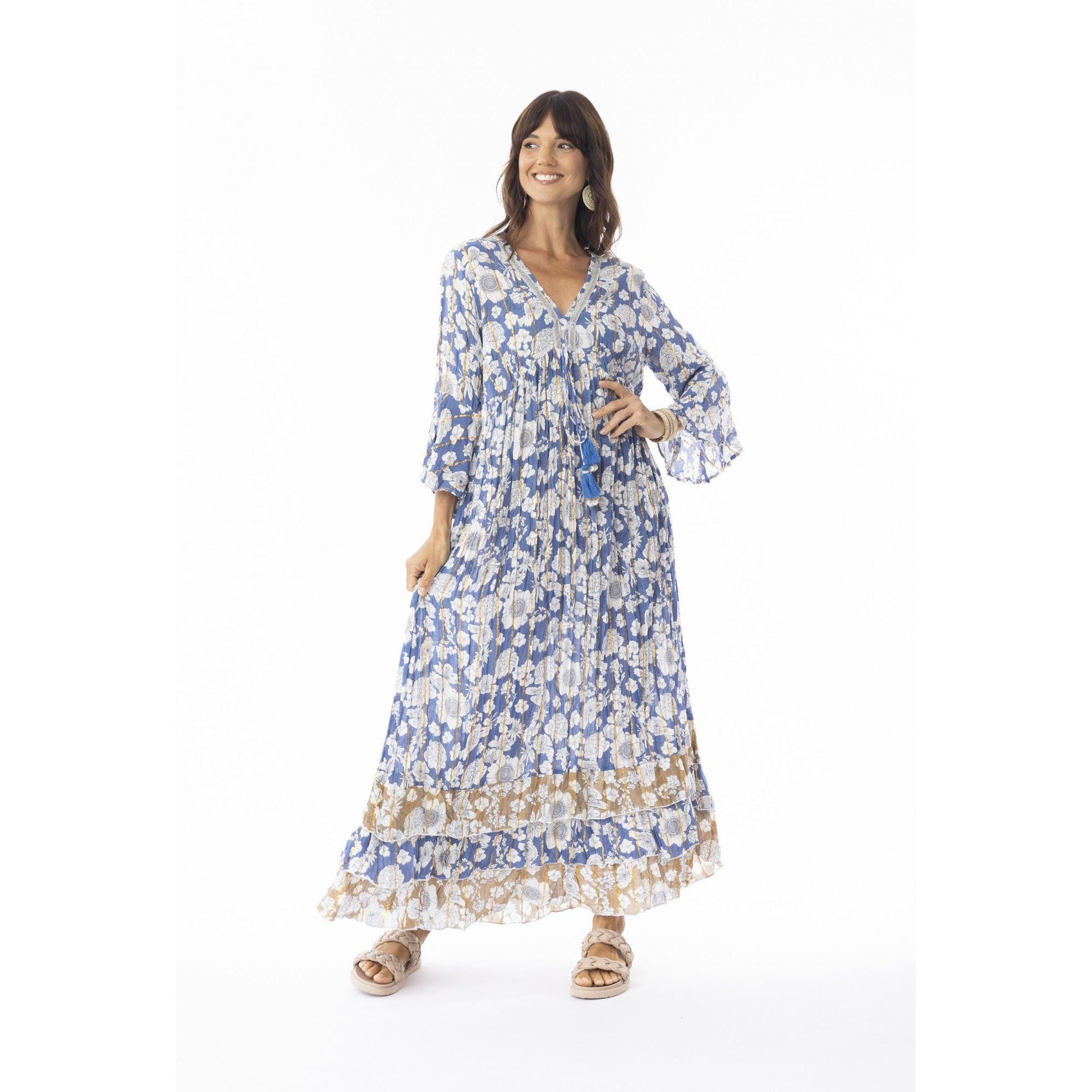 Set your sights on distant horizons in the dune-kissed Valentina Maxi Tie Dress. Golden accents ripple through delicate white floral motifs, all set against a rich, royal blue canvas. The intricately beaded V-neckline and subtle mid-sleeve slits add an air of refined allure, making this dress an unforgettable choice for any occasion.