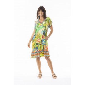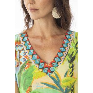 Adorn your soul with the breathtaking Georgia Frill Short Sleeve Hem Dress. Gathered seams under the bust fall into a-line layers with its bejewelled turquoise accents, wild escape print and waved trim to create a cute and flattering silhouette. Intricate florals, vibrant colours, and frill details make this top a unique addition to your summer wardrobe!