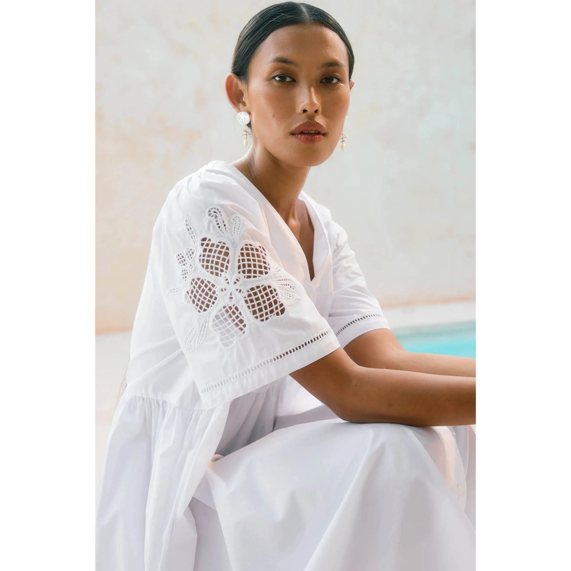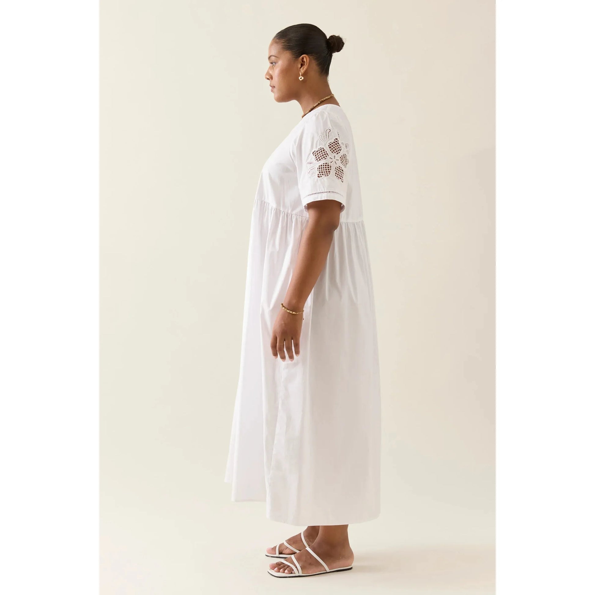Looking for the perfect summer dress? The Ilsa Dress has arrived. Crafted in breathable cotton poplin with delicate cutwork embroidery and ladder lace, this button-through style balances structure with softness.