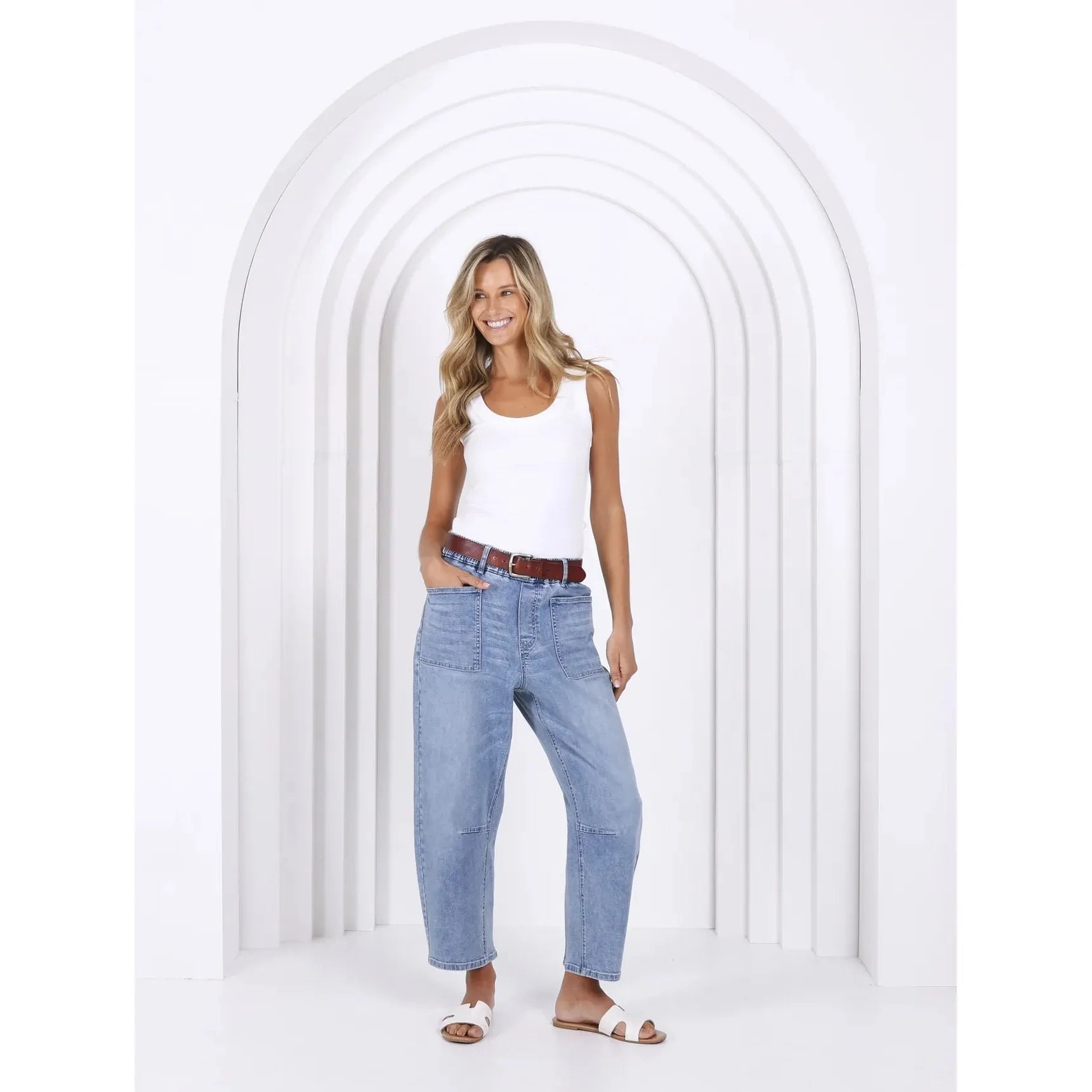 Characteristics of Leo Barrel-Leg Jeans include a fitted waist, flared-out shape around the mid-leg, and tapered silhouette at the bottom, which exudes the look of, well, a barrel. It's the vibe of a cowboy ready for a showdown in the Wild, Wild West!!!