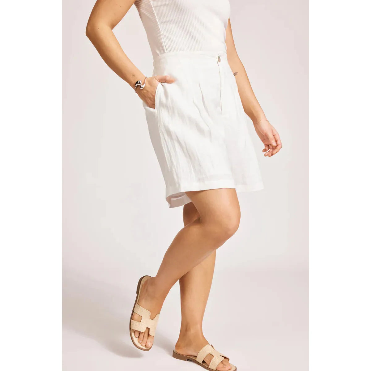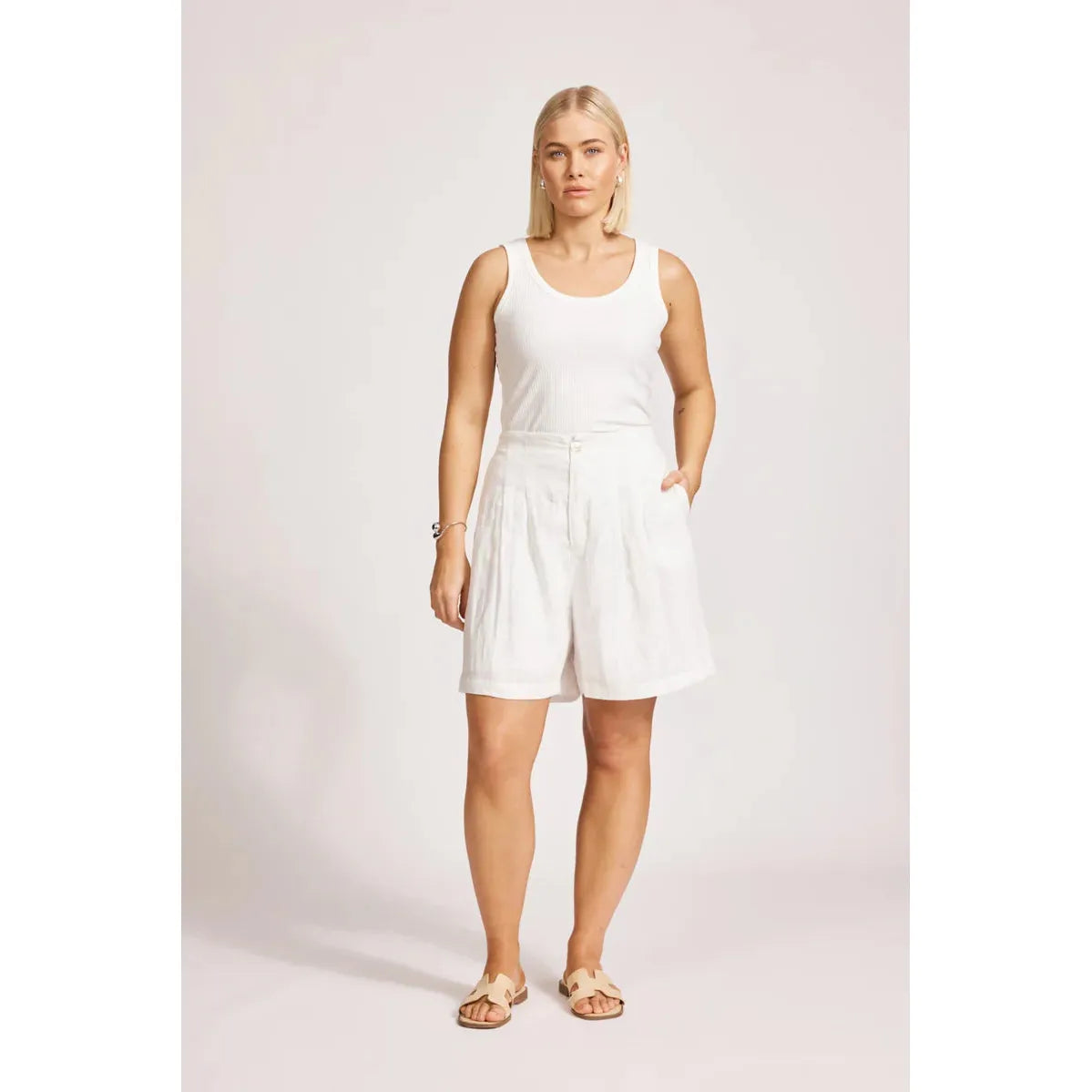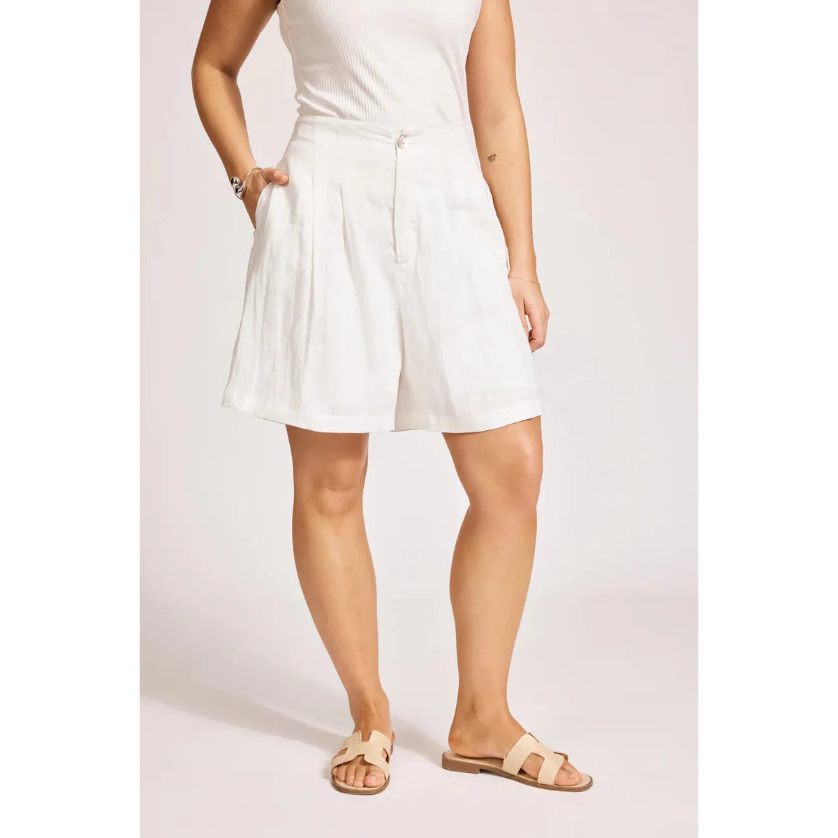 A high-waisted staple designed for warm-weather ease. Crafted from 100% linen with a flat front and elasticated back waist. Features subtle pleat detailing and a mid-length wide leg for relaxed movement. Fully lined for comfort.