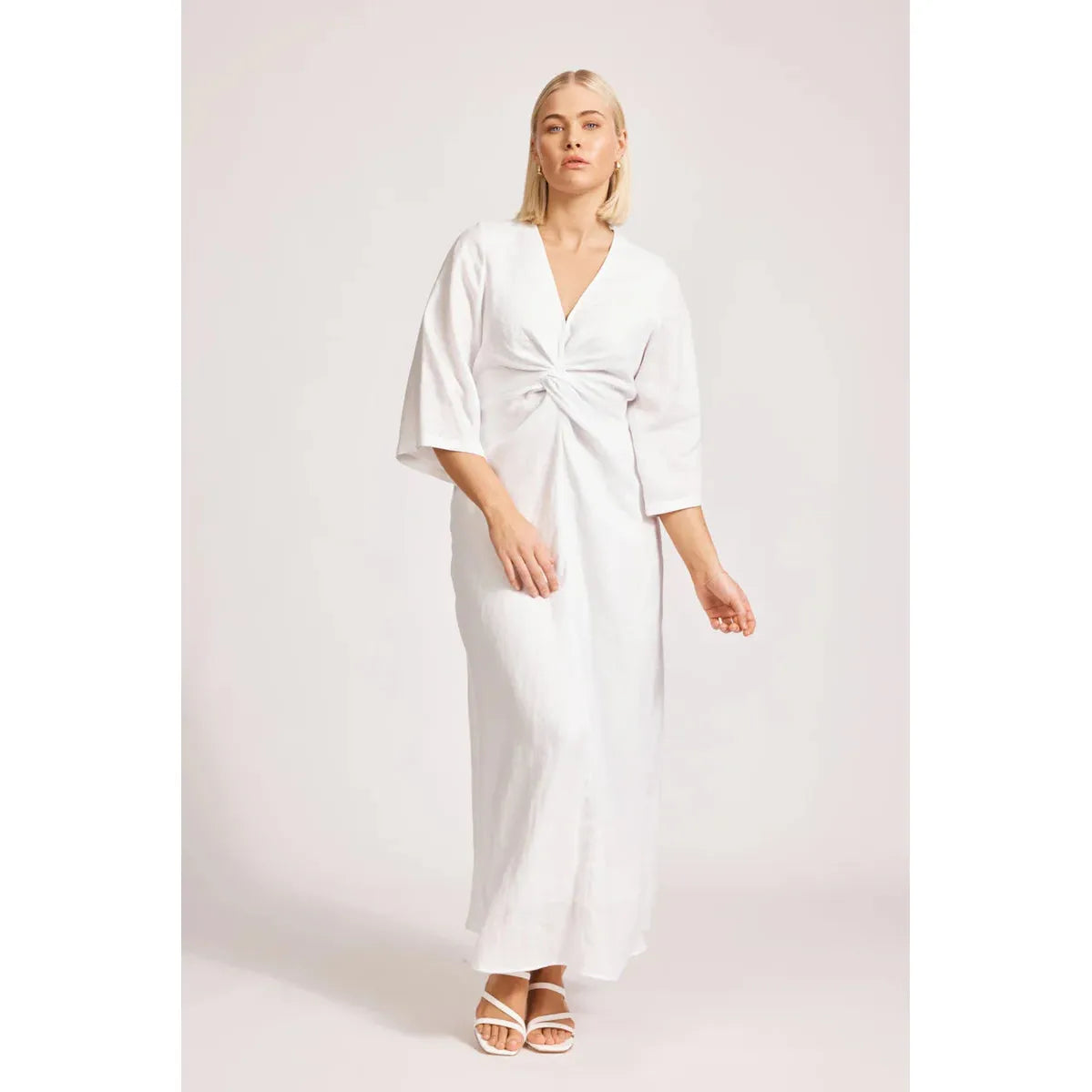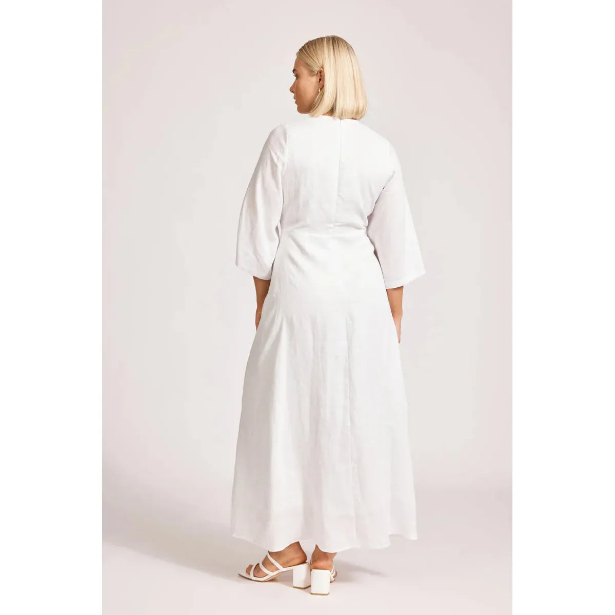 A show-stopping linen maxi designed for elegant summer dressing. Crafted from 100% linen for breathability. Features a fixed twist detail at the front to contour the waist, V neckline with hook-and-eye closure option, and mid-length relaxed sleeves.
