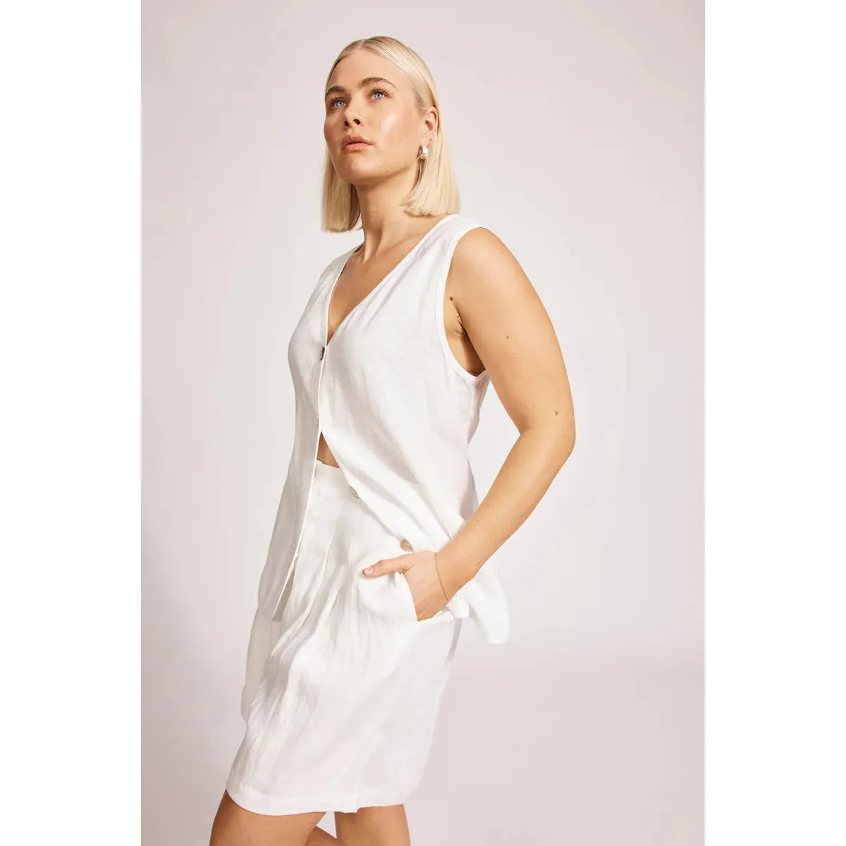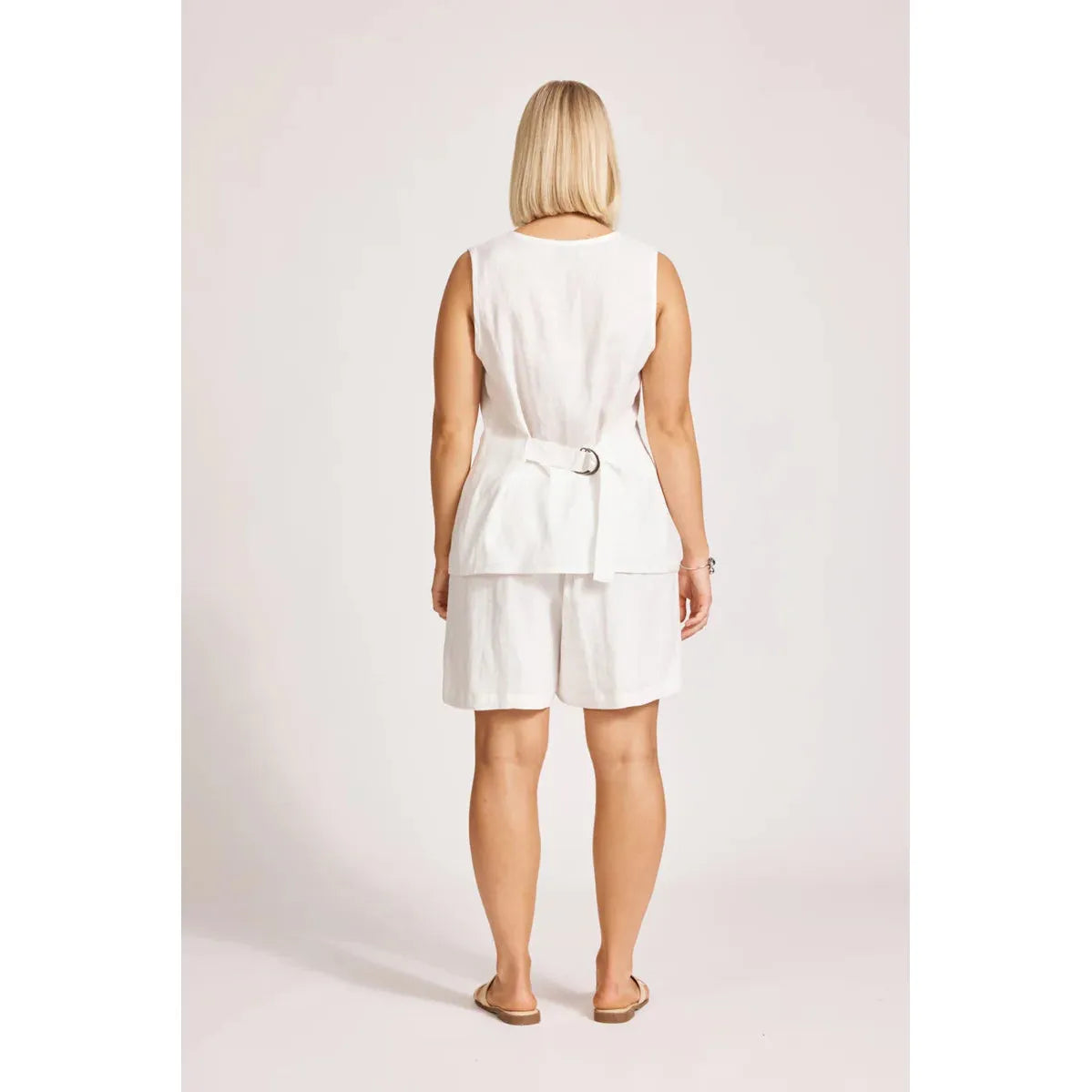 A relaxed essential with tailored flair. Crafted from 100% linen for breathable style. Features front button closures, curved hemline, and a D-ring puller at the back for a custom flattering fit at the waist.