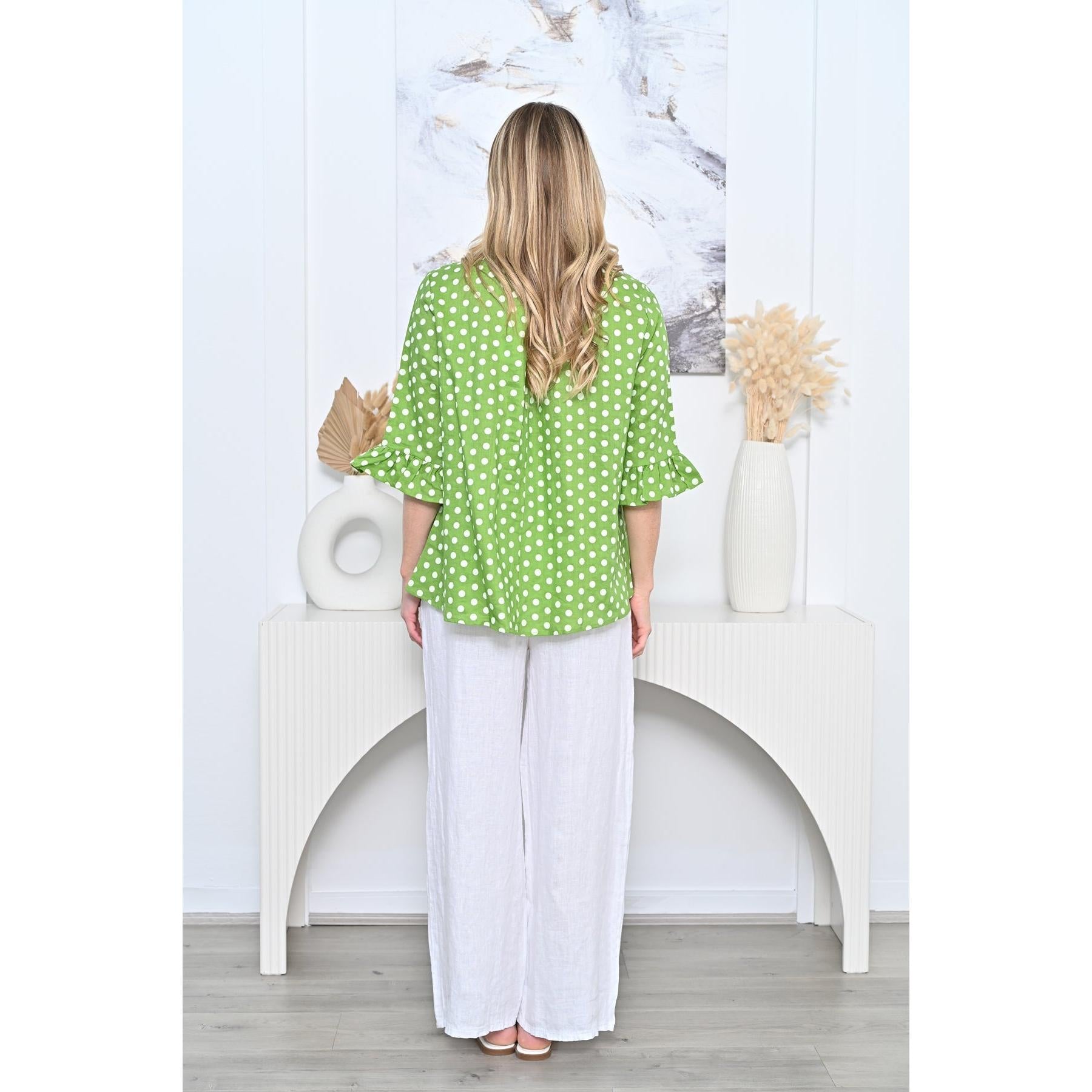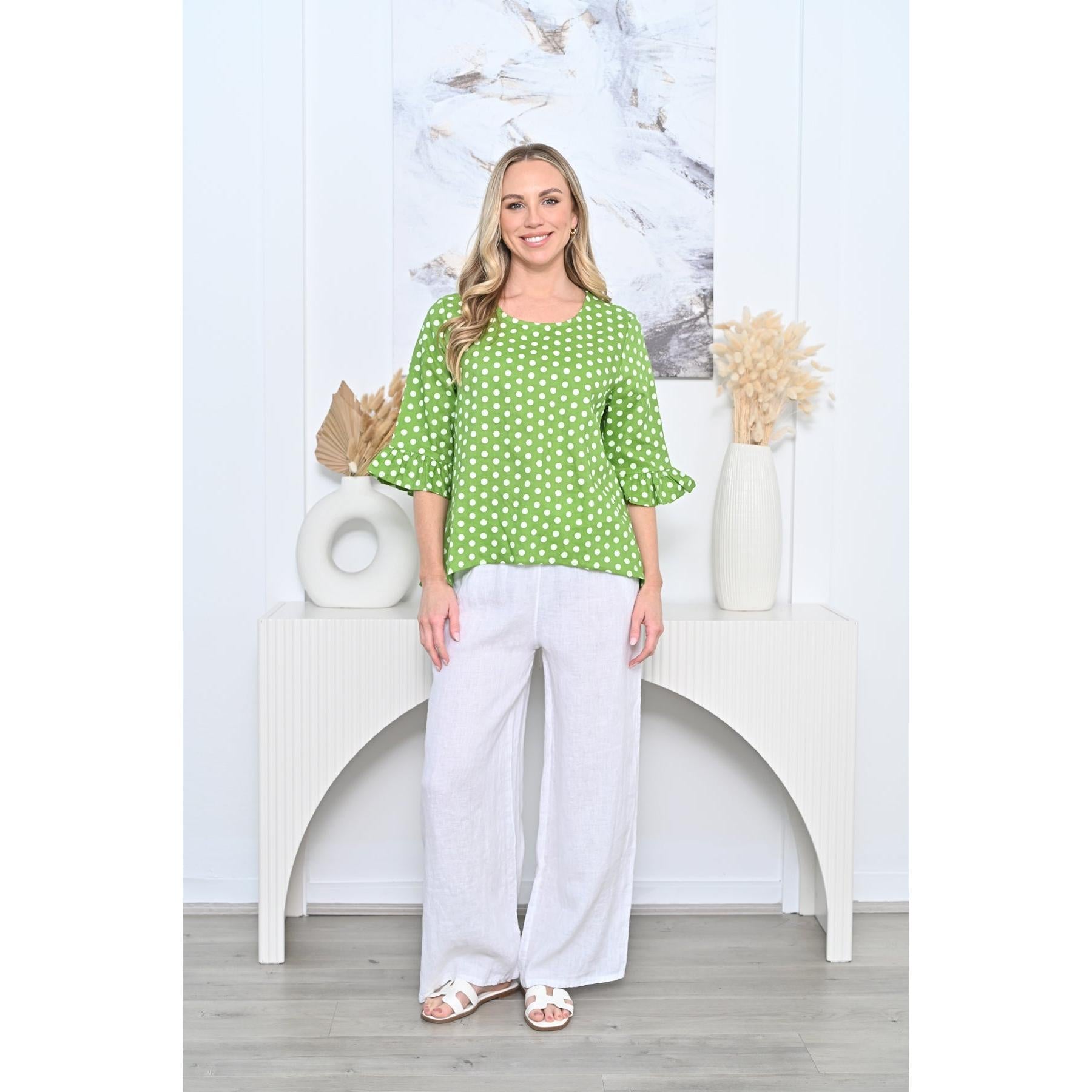 Expertly crafted from luxe linen our Molly dot top boasts a round neck, 3/4 sleeve with frill detail, and an elegant a-line shape that flatters every body type. With a slight hi-lo hem, this top is both stylish and comfortable, making it a must-have addition to any wardrobe.