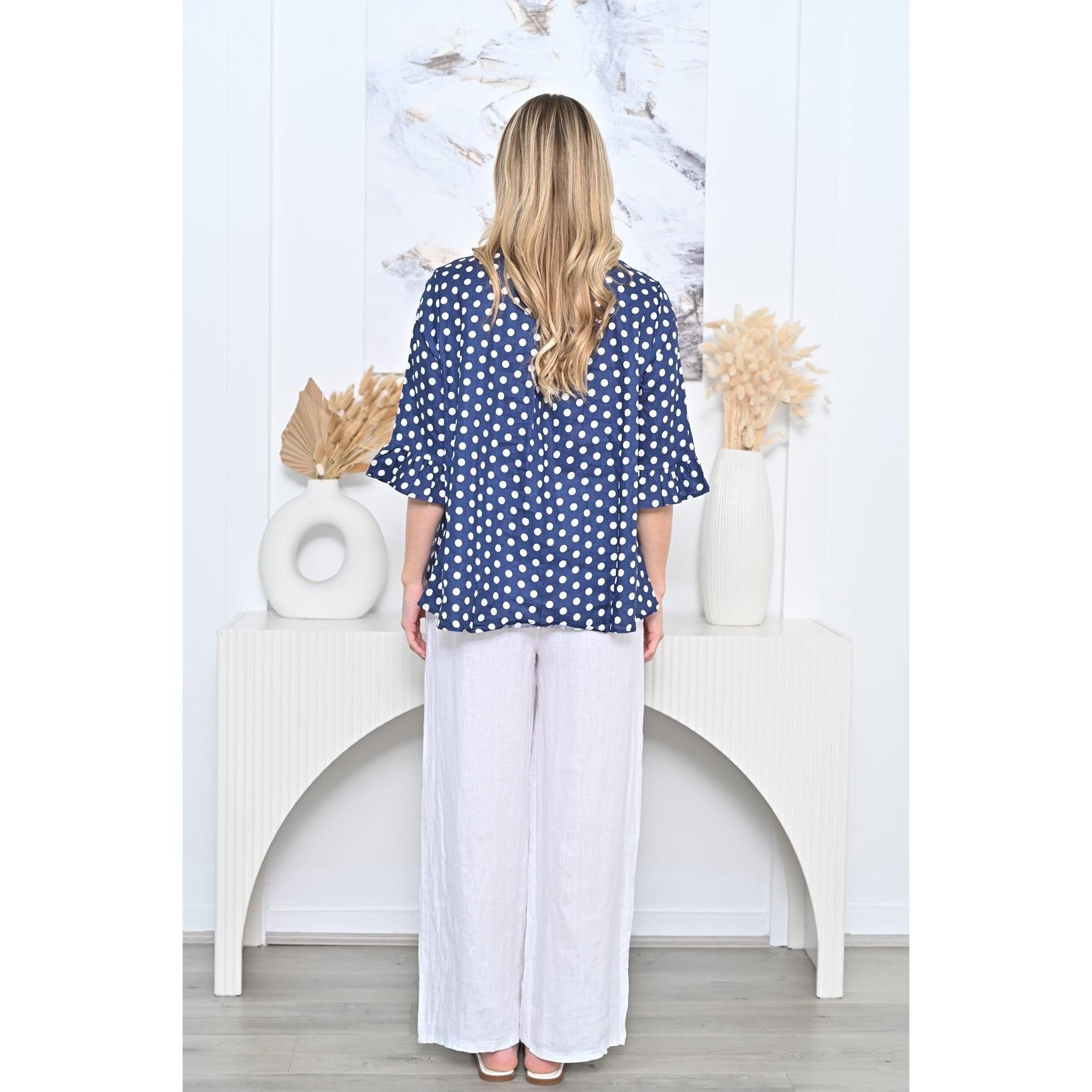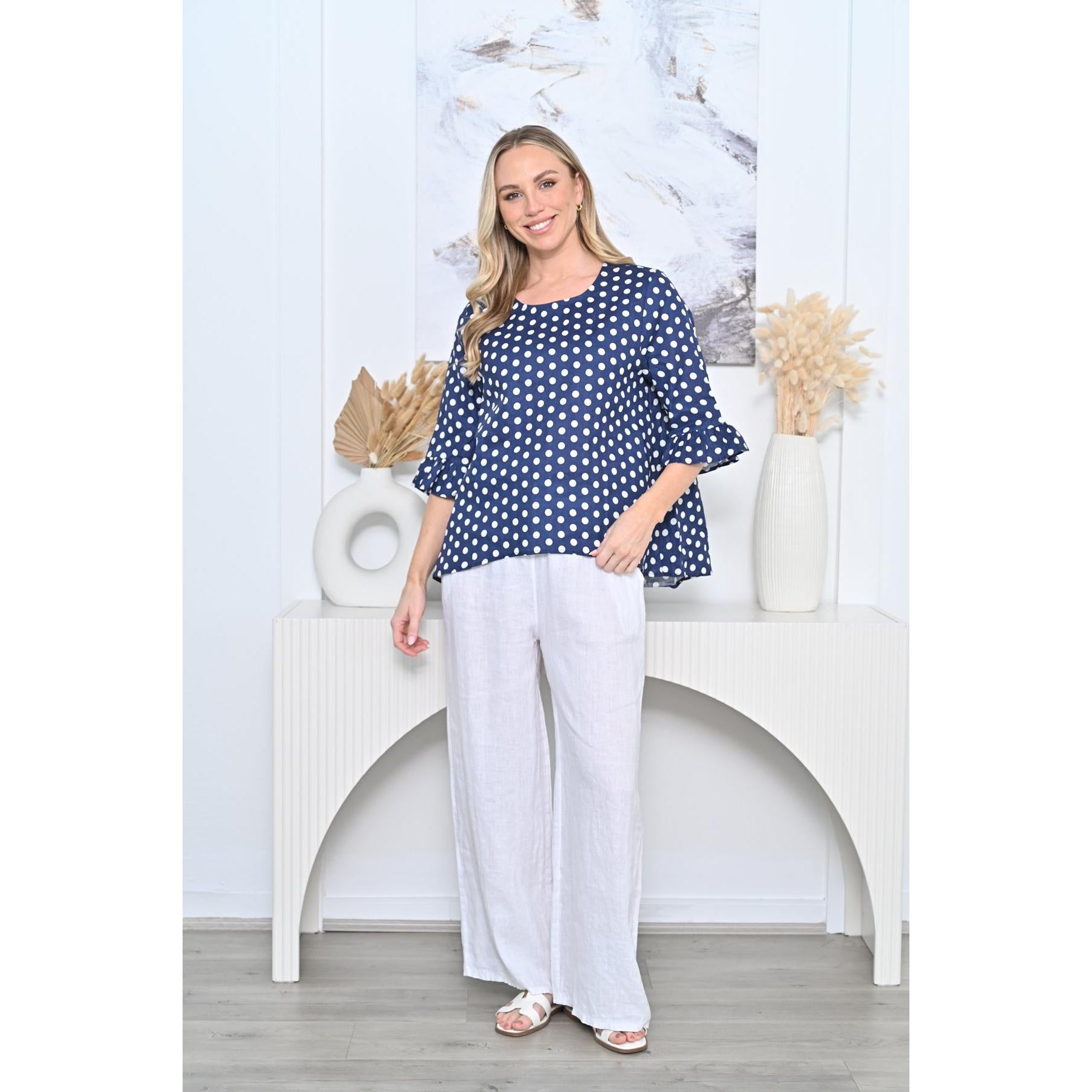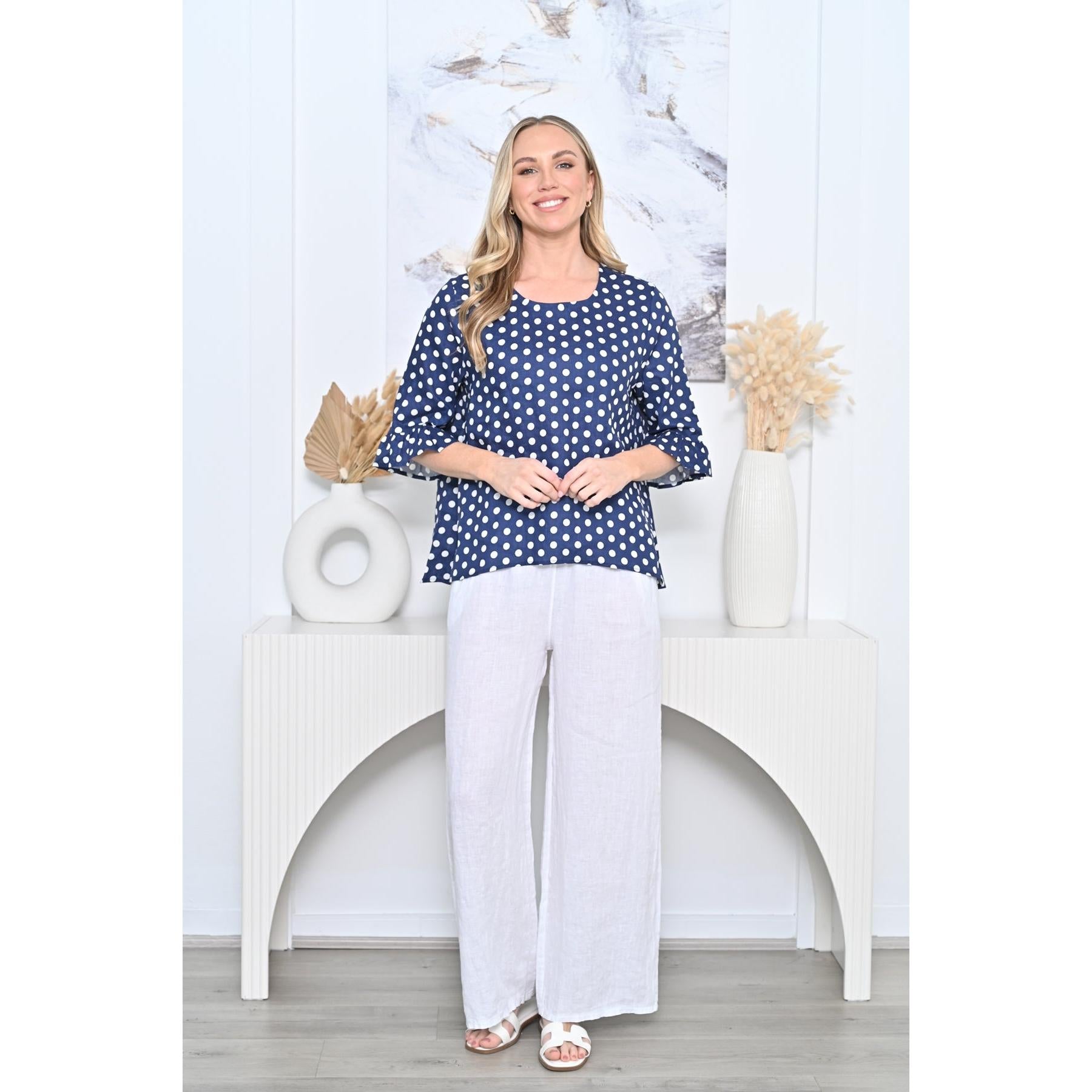 Expertly crafted from luxe linen our Molly dot top boasts a round neck, 3/4 sleeve with frill detail, and an elegant a-line shape that flatters every body type. With a slight hi-lo hem, this top is both stylish and comfortable, making it a must-have addition to any wardrobe.