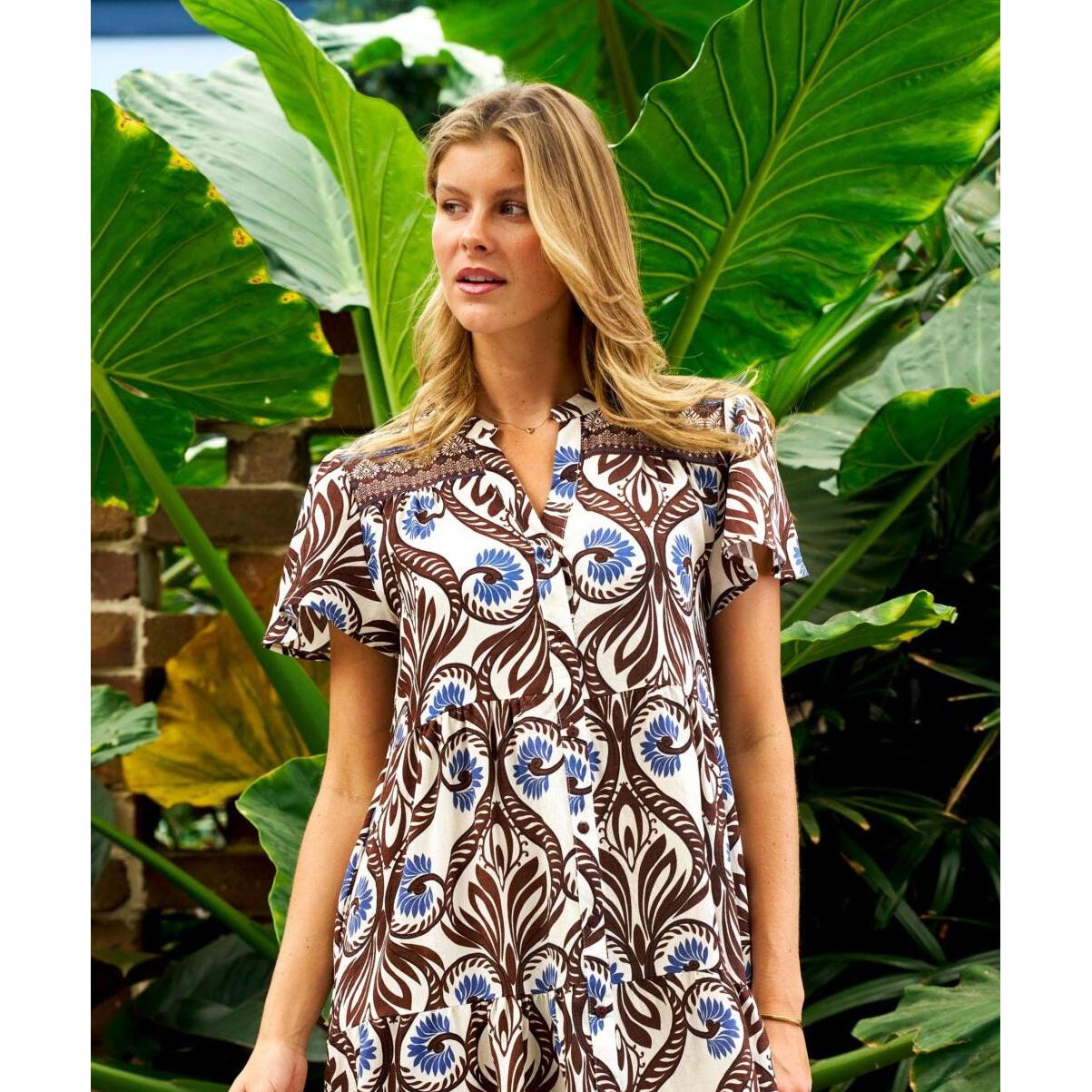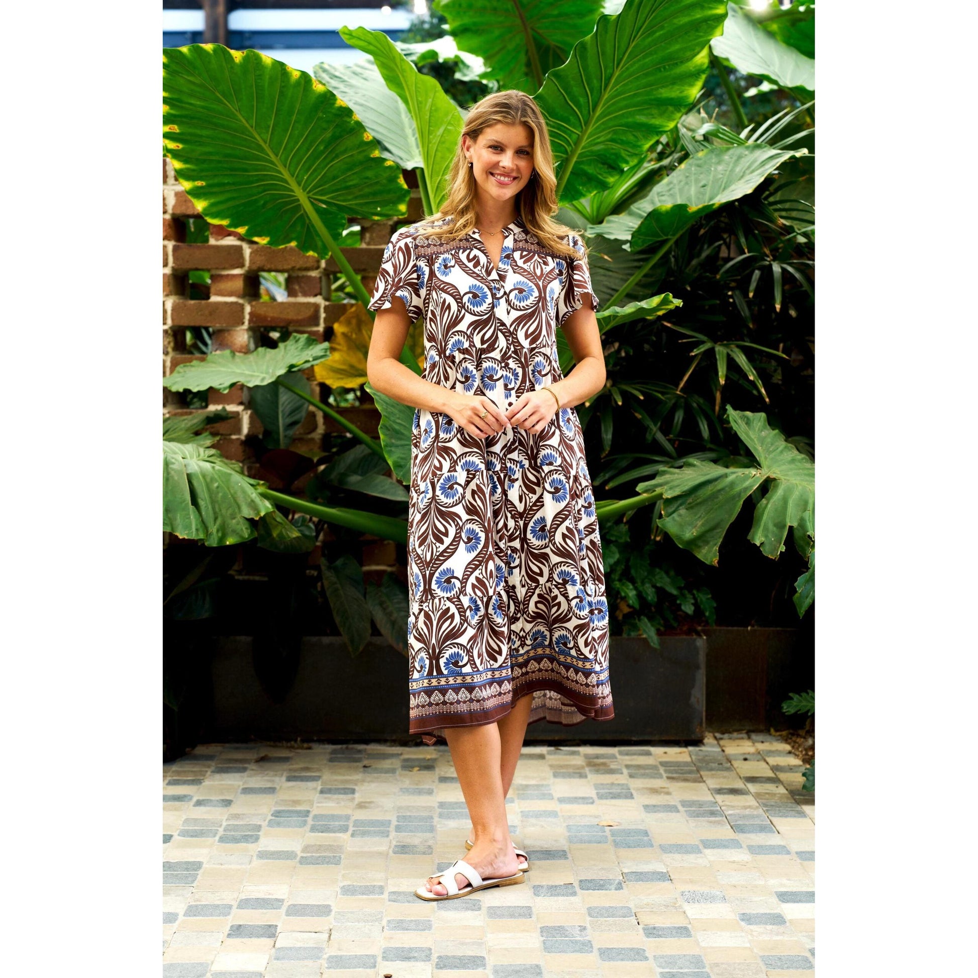 Effortless elegance meets everyday comfort in our Mona V-neck midi dress. Crafted from a luxurious viscose and rayon blend, it features a functional center front placket with buttons, flutter sleeves, and practical side seam pockets. The relaxed fit and midi-length cut provide a flattering silhouette, while the charming border print at the hem adds a subtle design detail. Perfect for transitioning from day to night with understated style.