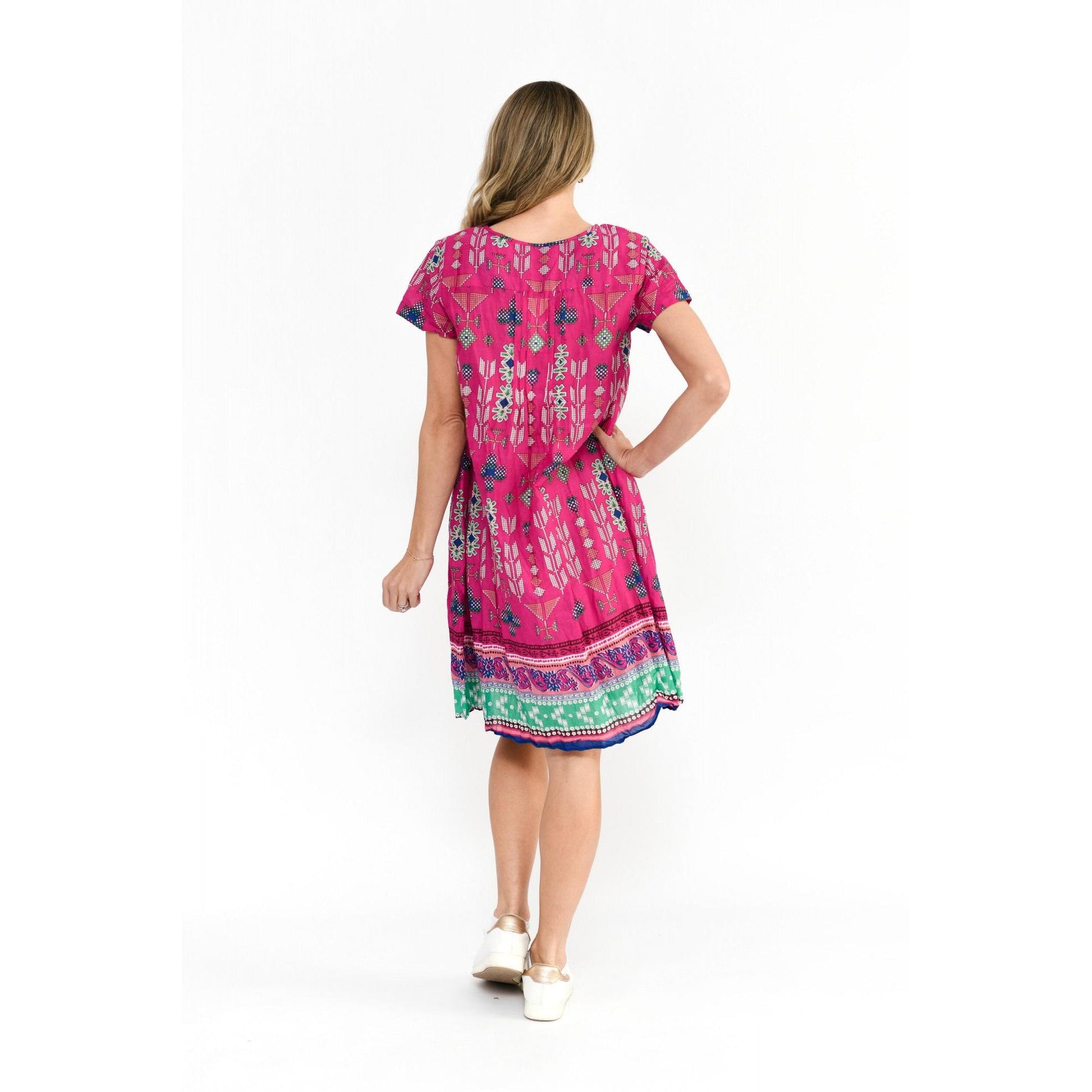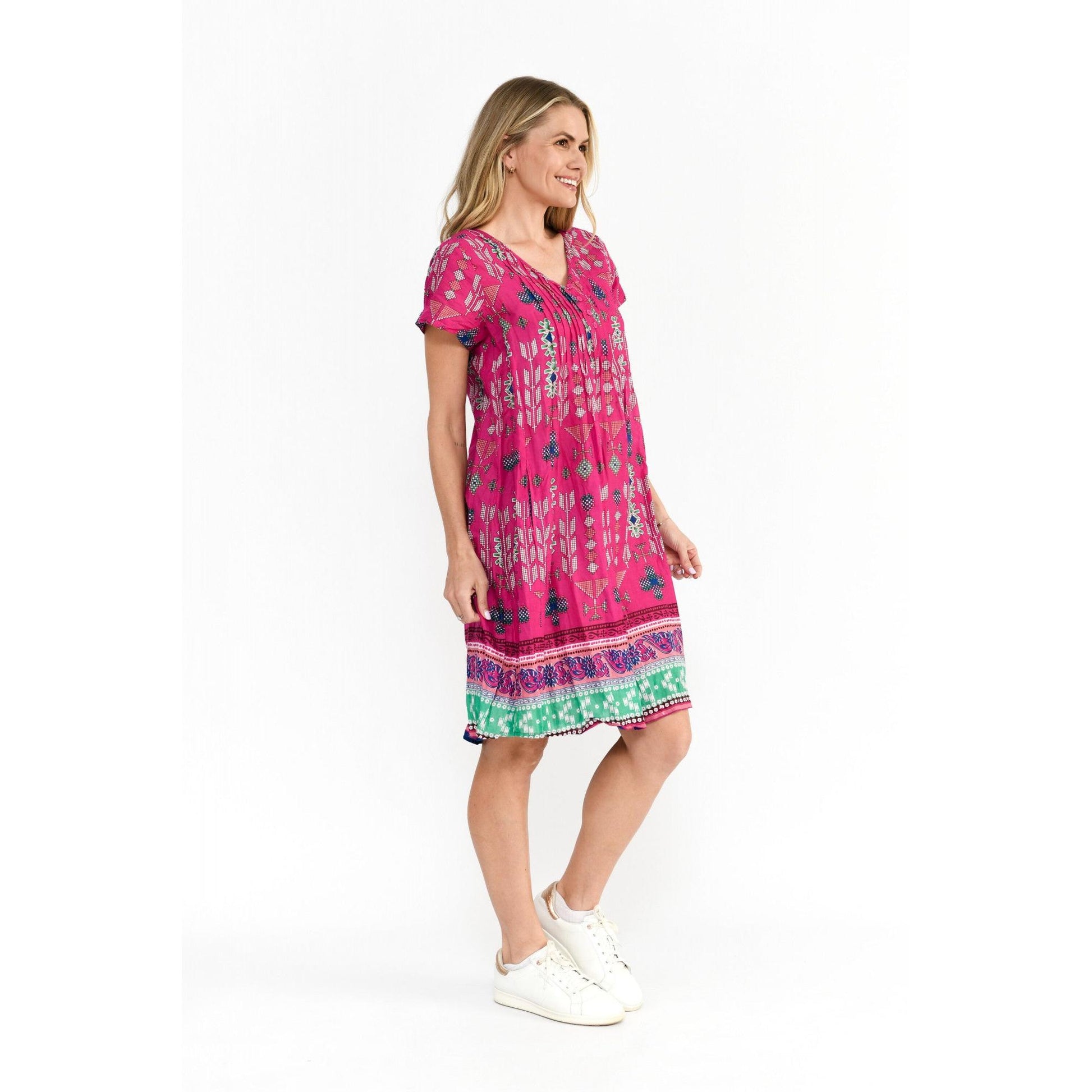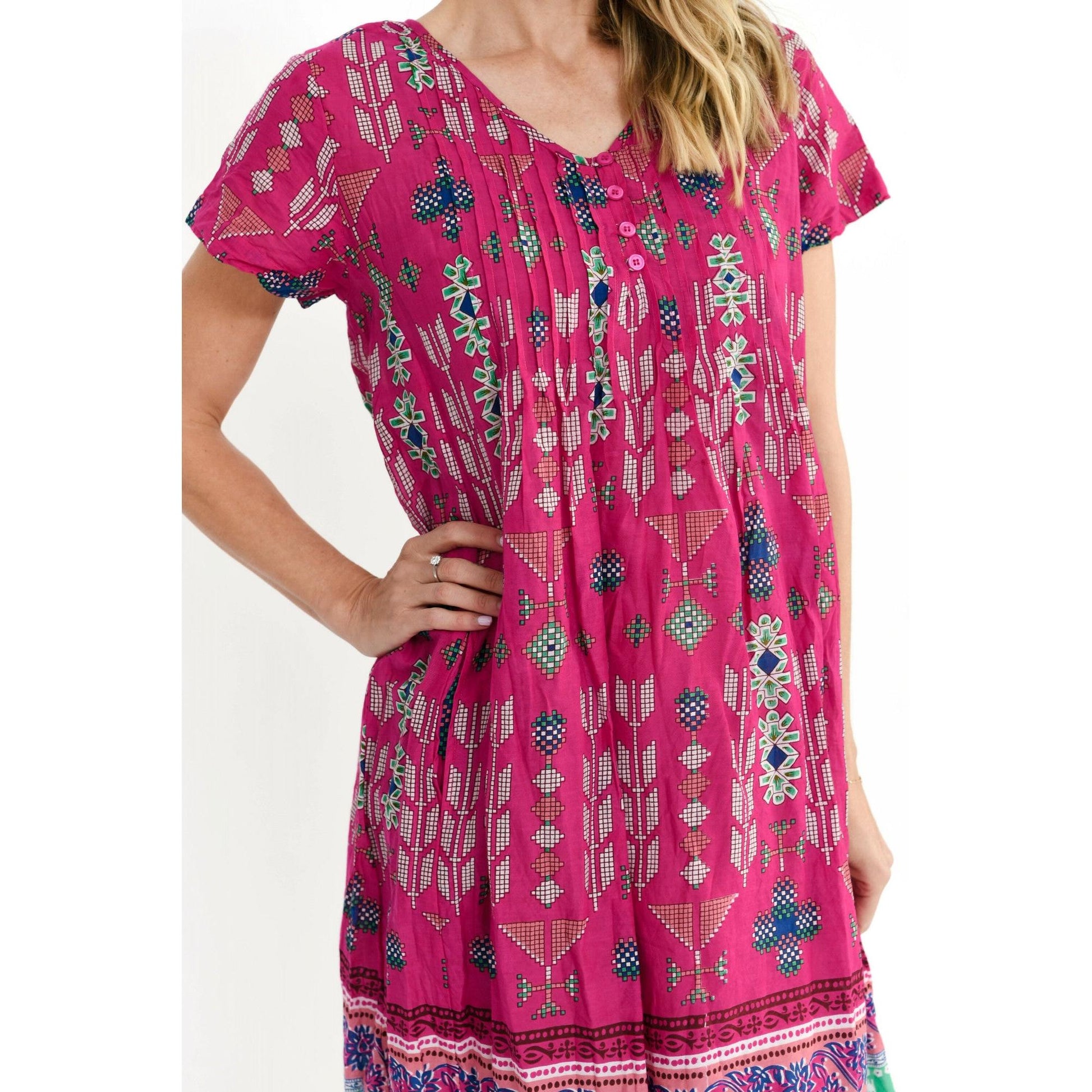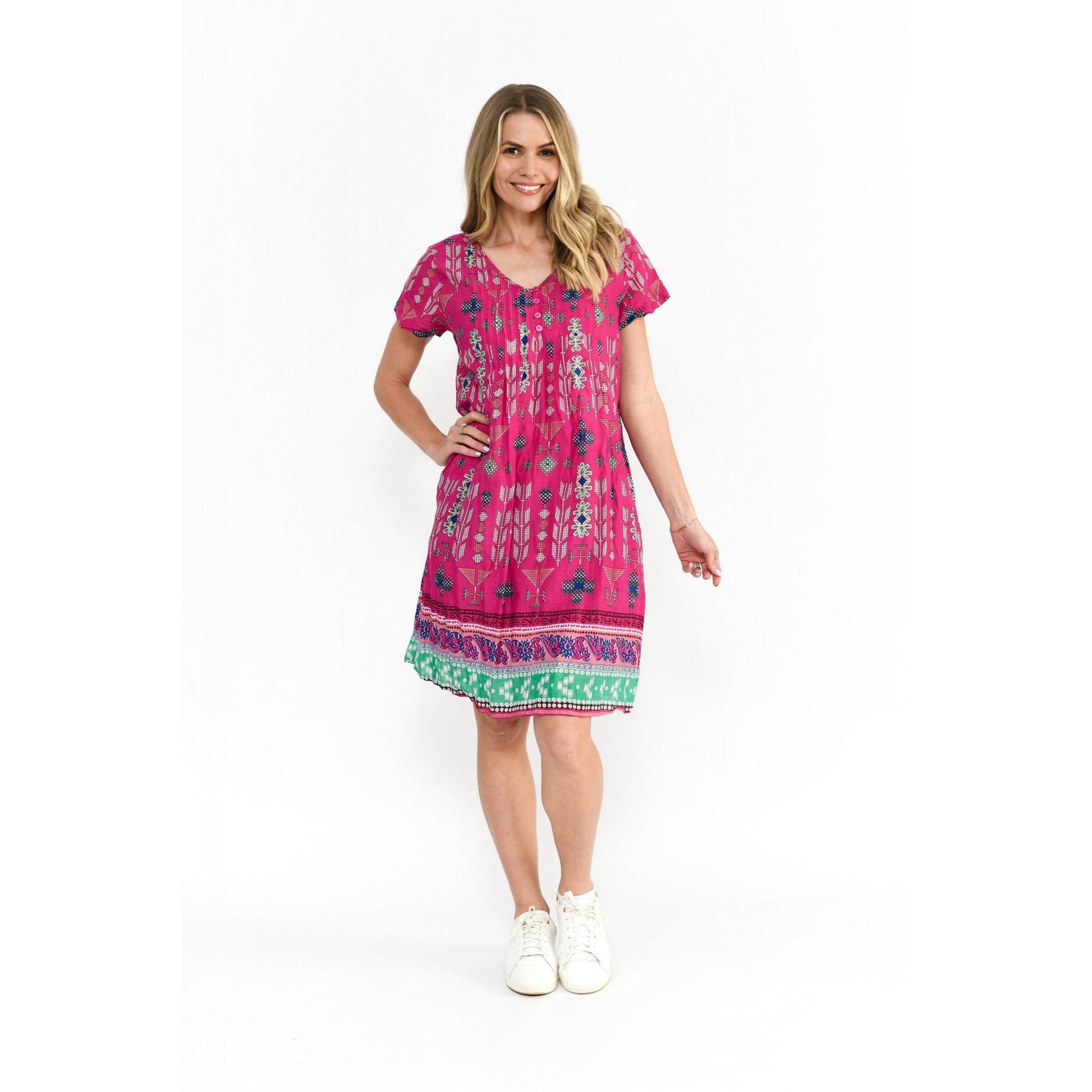 Our Nicola Dress is a customer favourite for the Spring/Summer season, fabulous short sleeve pleated crinkle dress in a new fresh print, a light weight Crinkle Cotton fabric NO IRONING