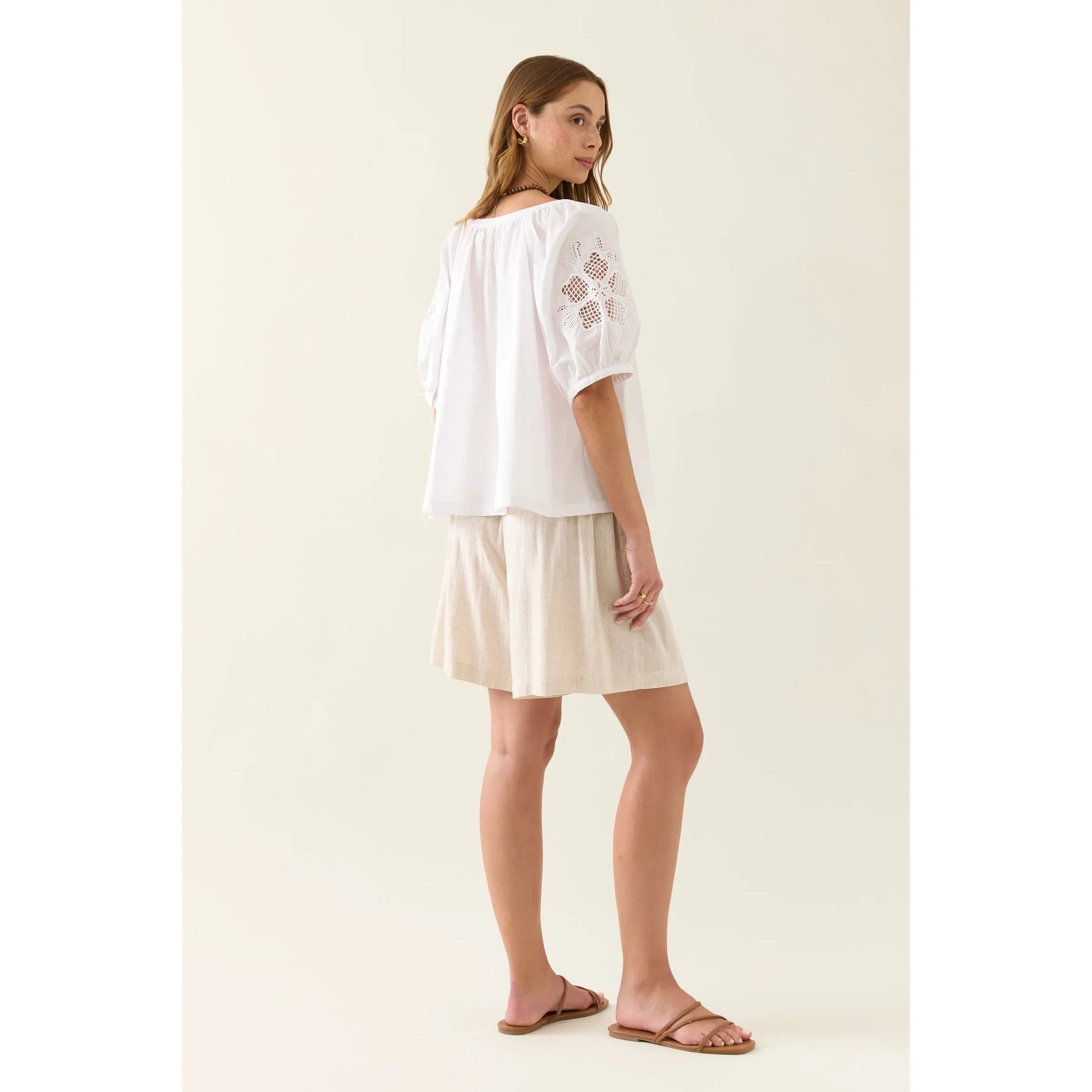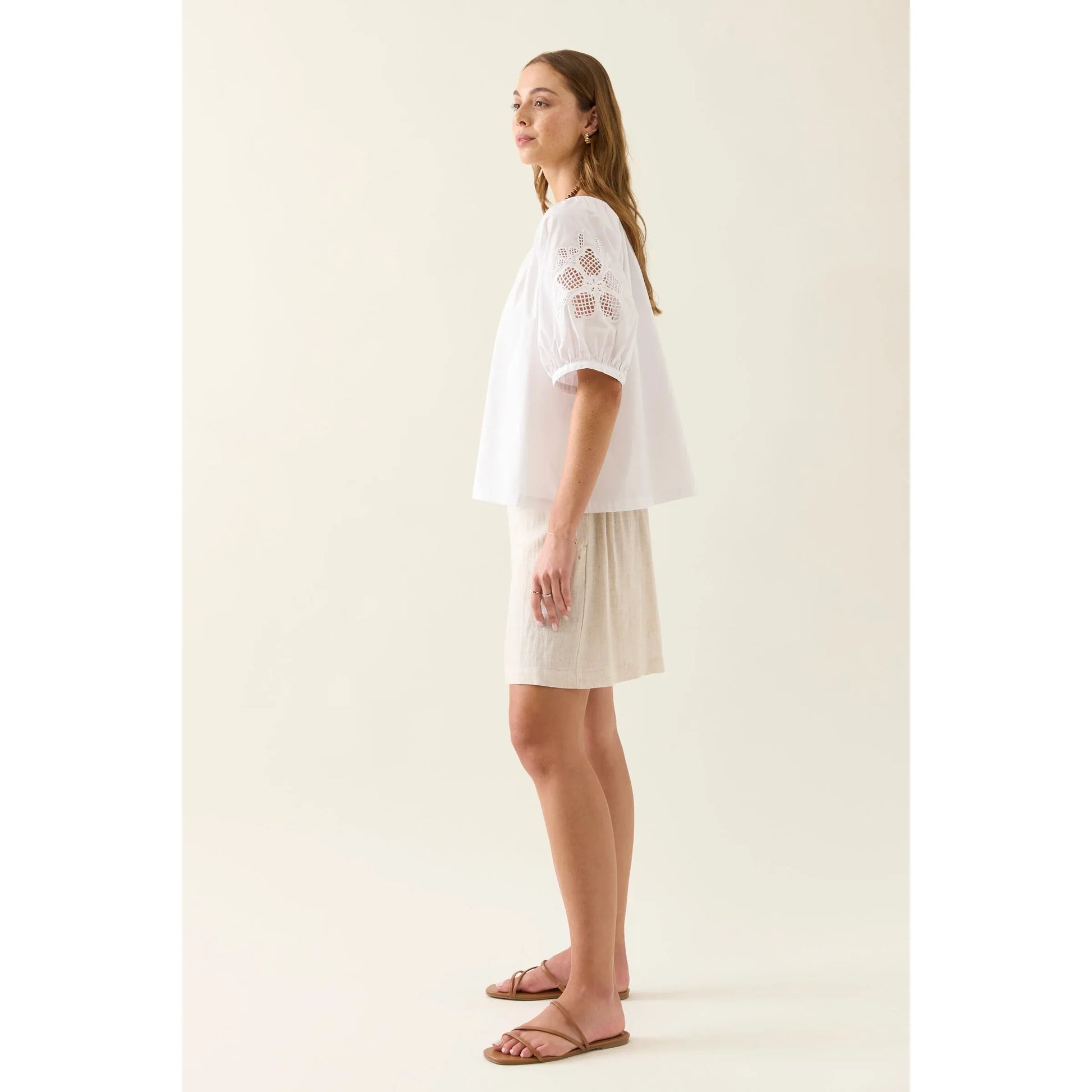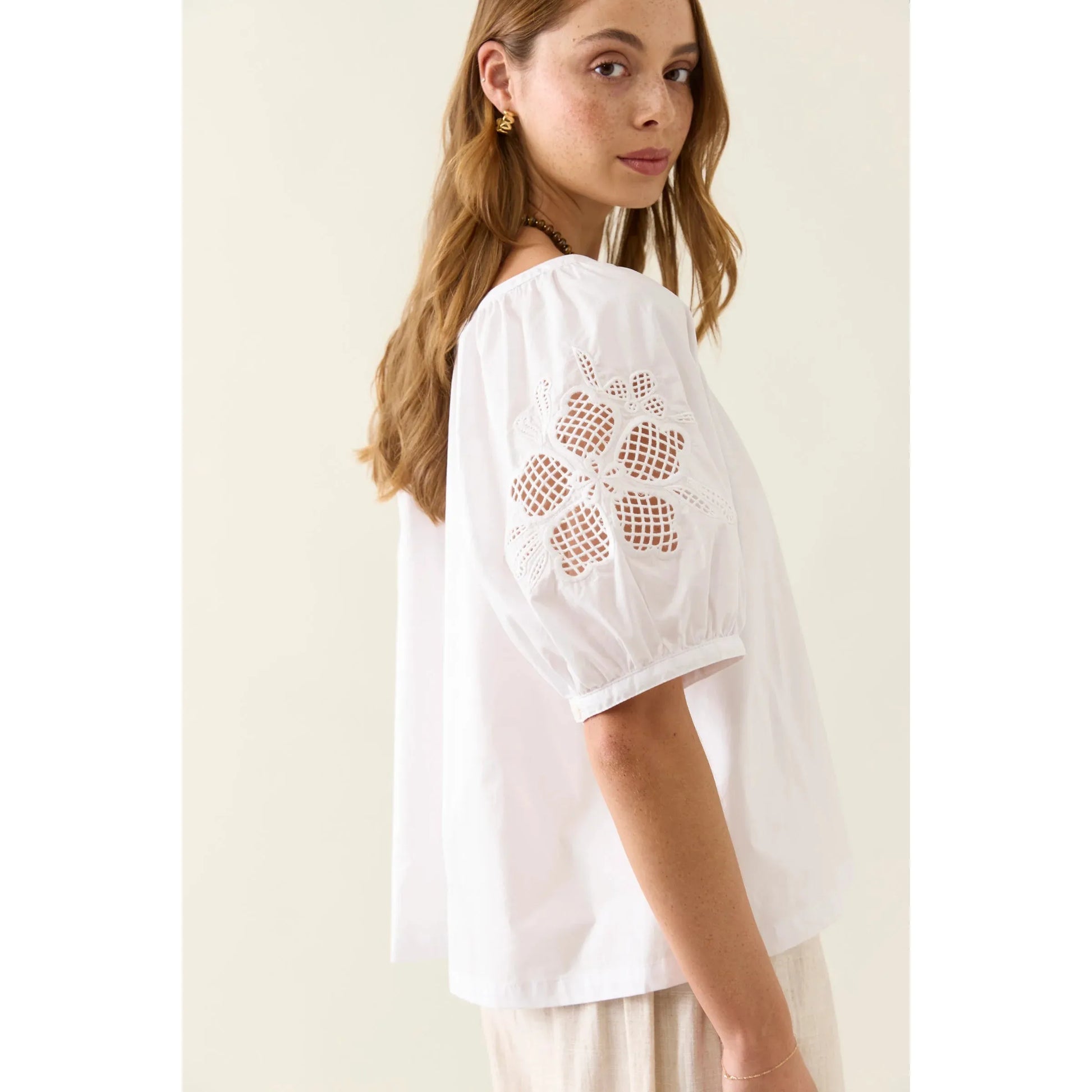 Crisp cotton poplin meets delicate cutwork embroidery in the Ilsa Button Top. Featuring a button-through front and softly puffed short sleeves, this charming piece reveals just a hint of skin through its intricate embroidered details.