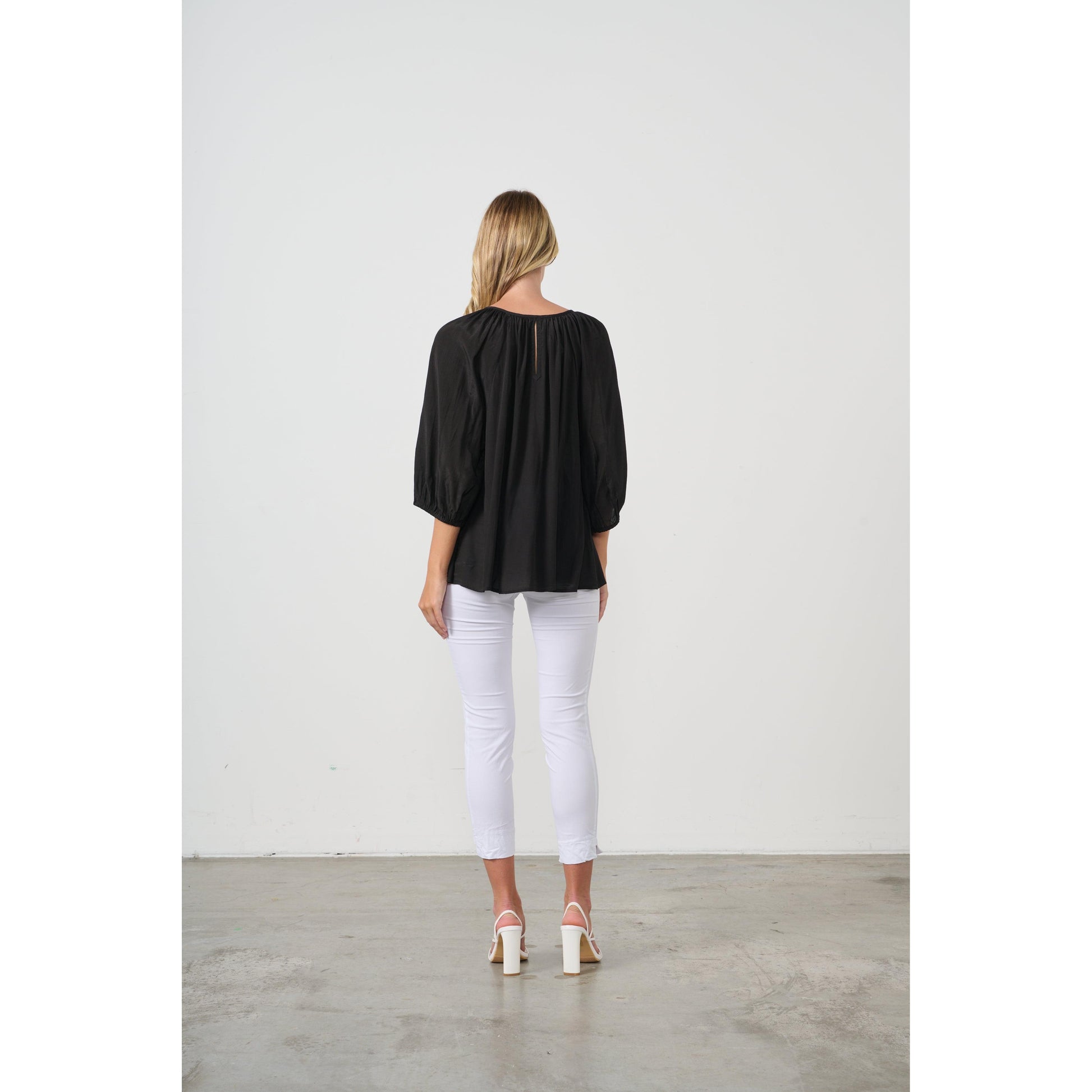 The Carina Top in plain Black features a round tie-neck design, blending subtle neutral tones with a vibrant, colorful tropical print. This top offers a refined yet lively look, perfect for adding an expert touch to your casual or semi-formal wardrobe. The tie neck detail elevates the silhouette while ensuring comfortable wear throughout the day.