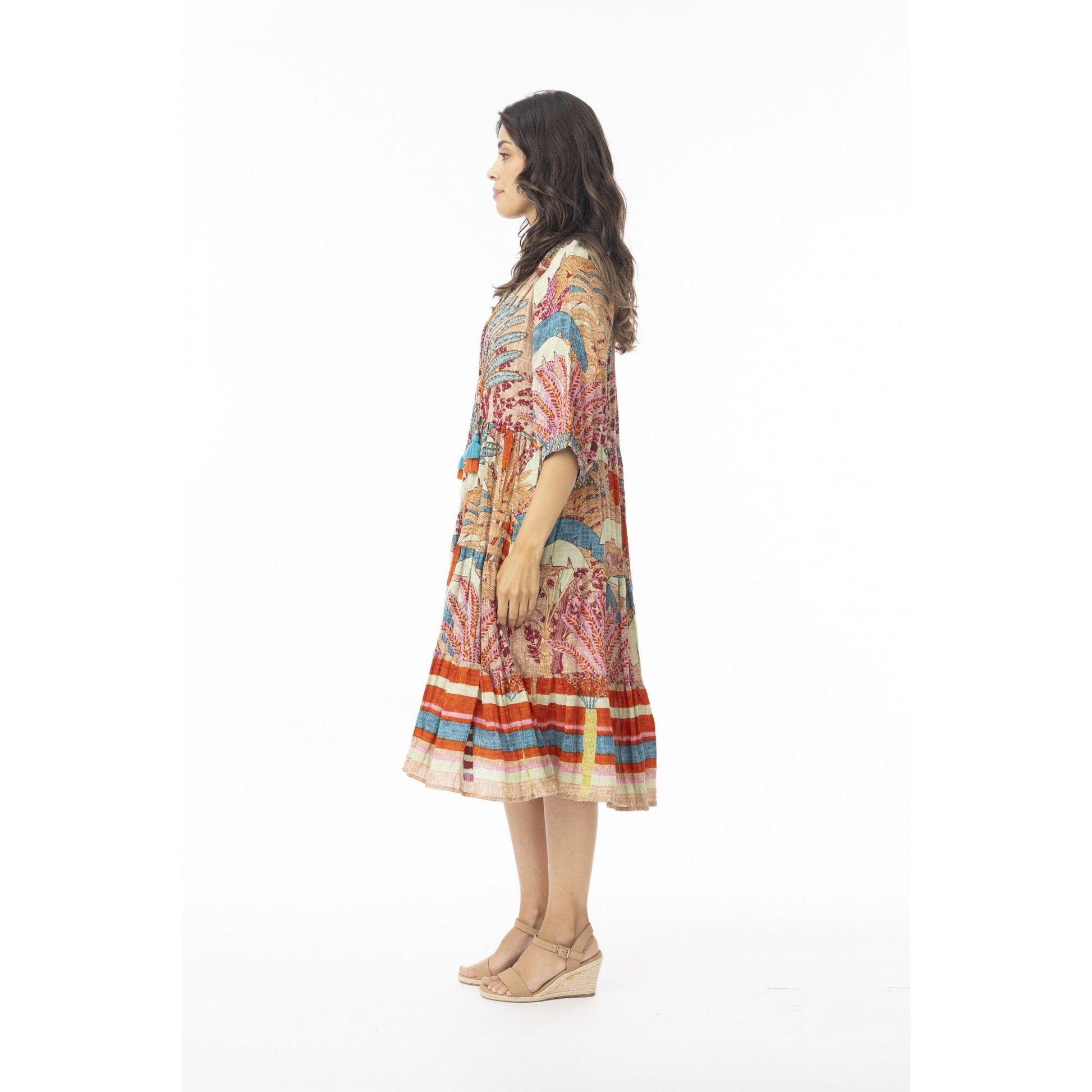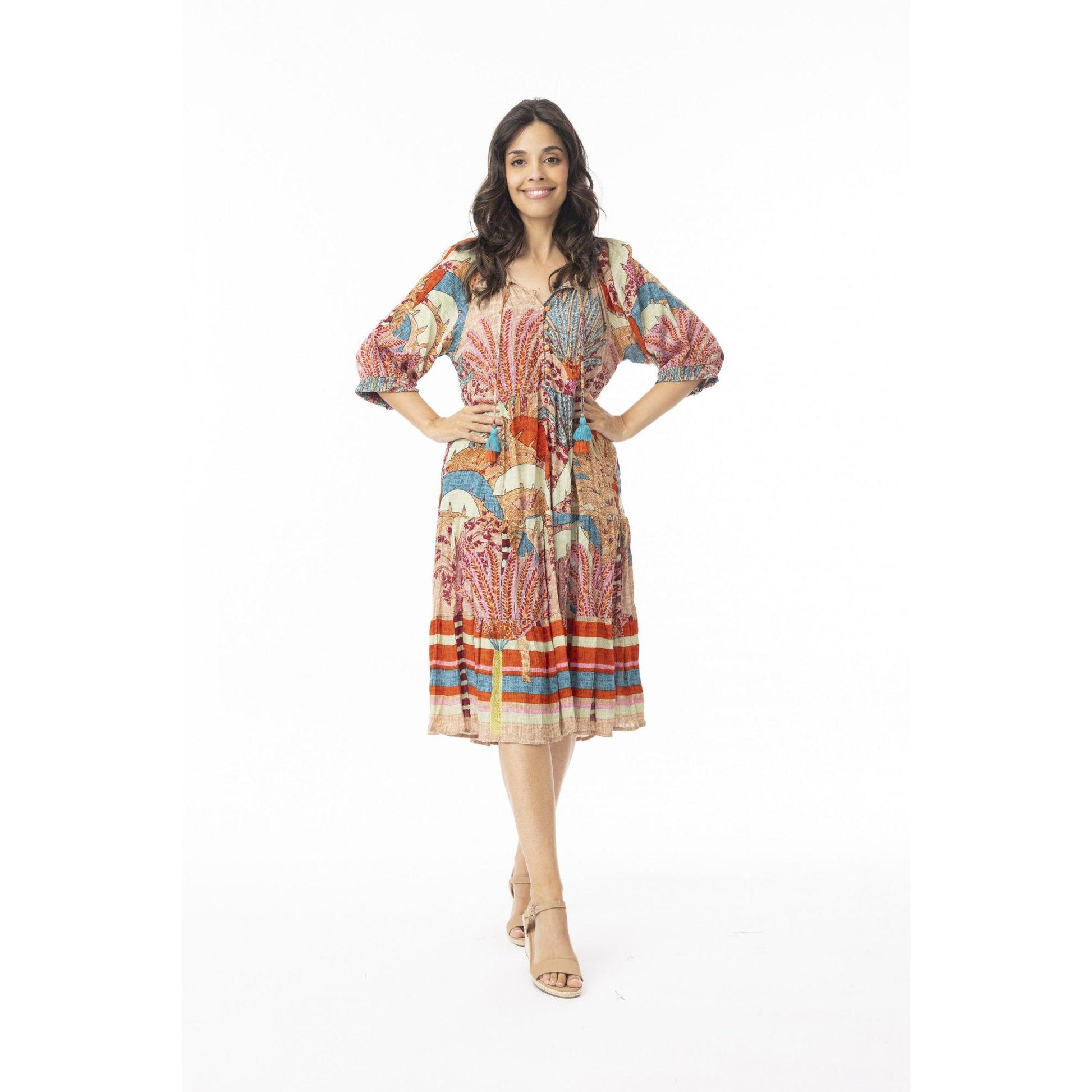 Make a statement with our gorgeous Ponta Verde Puff Sleeve Layer Dress, a perfect blend of coastal charm and summer elegance. Featuring a flattering V-neckline adorned with playful tassels and delicate buttons at the bust, this dress exudes effortless style. With short sleeves and a tiered knee-length skirt, it offers both comfort and grace, making it an essential piece for sunny days and beachside soirées alike.