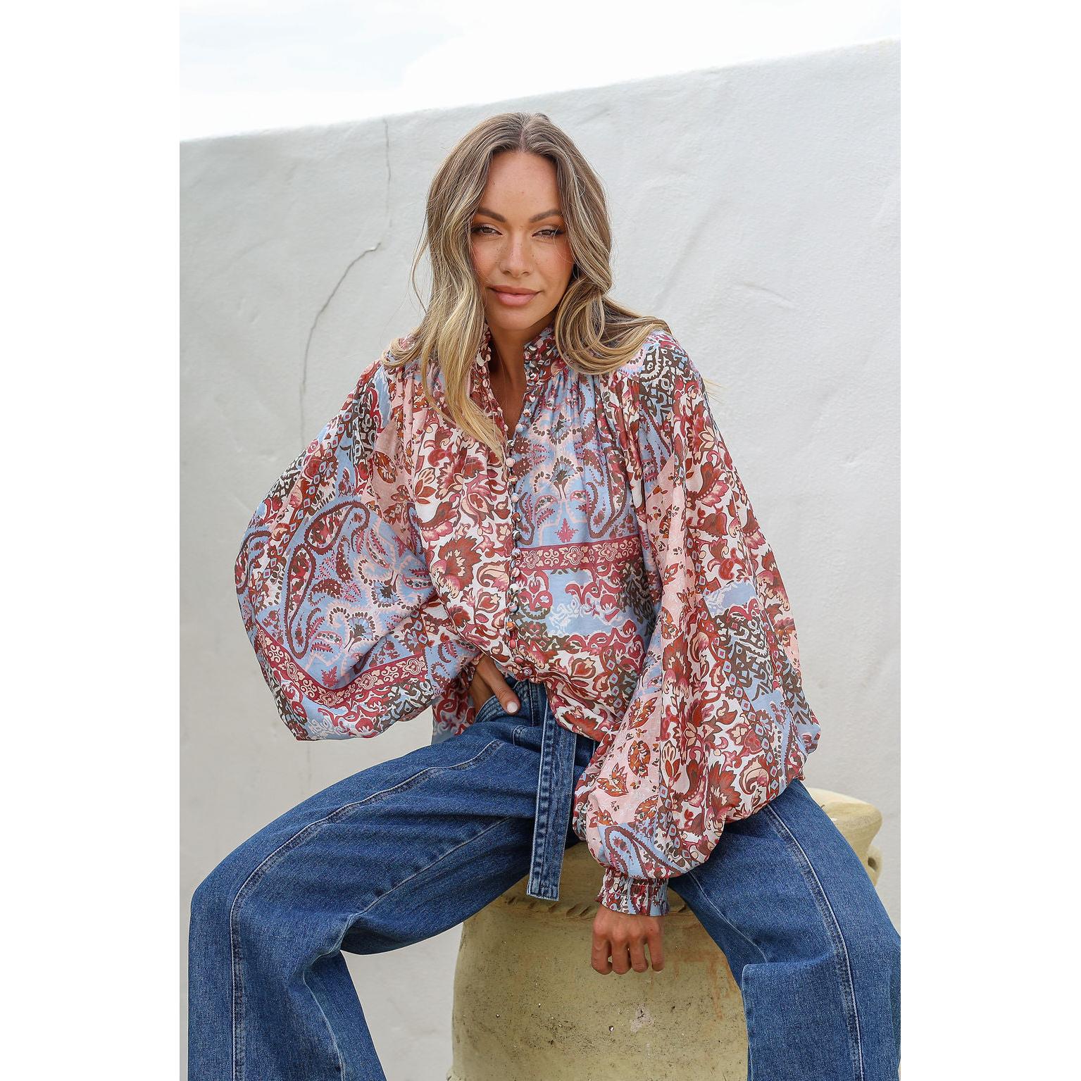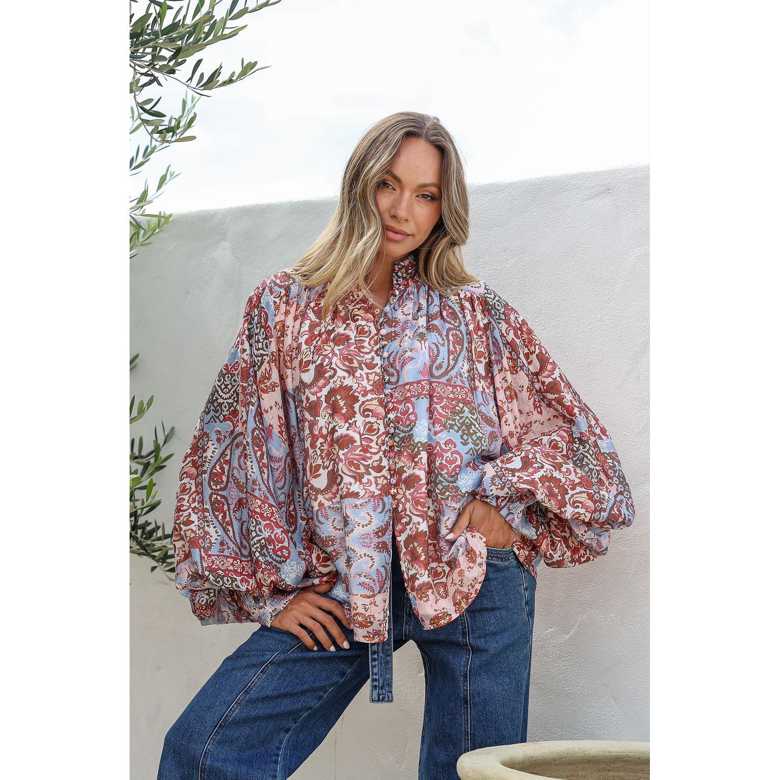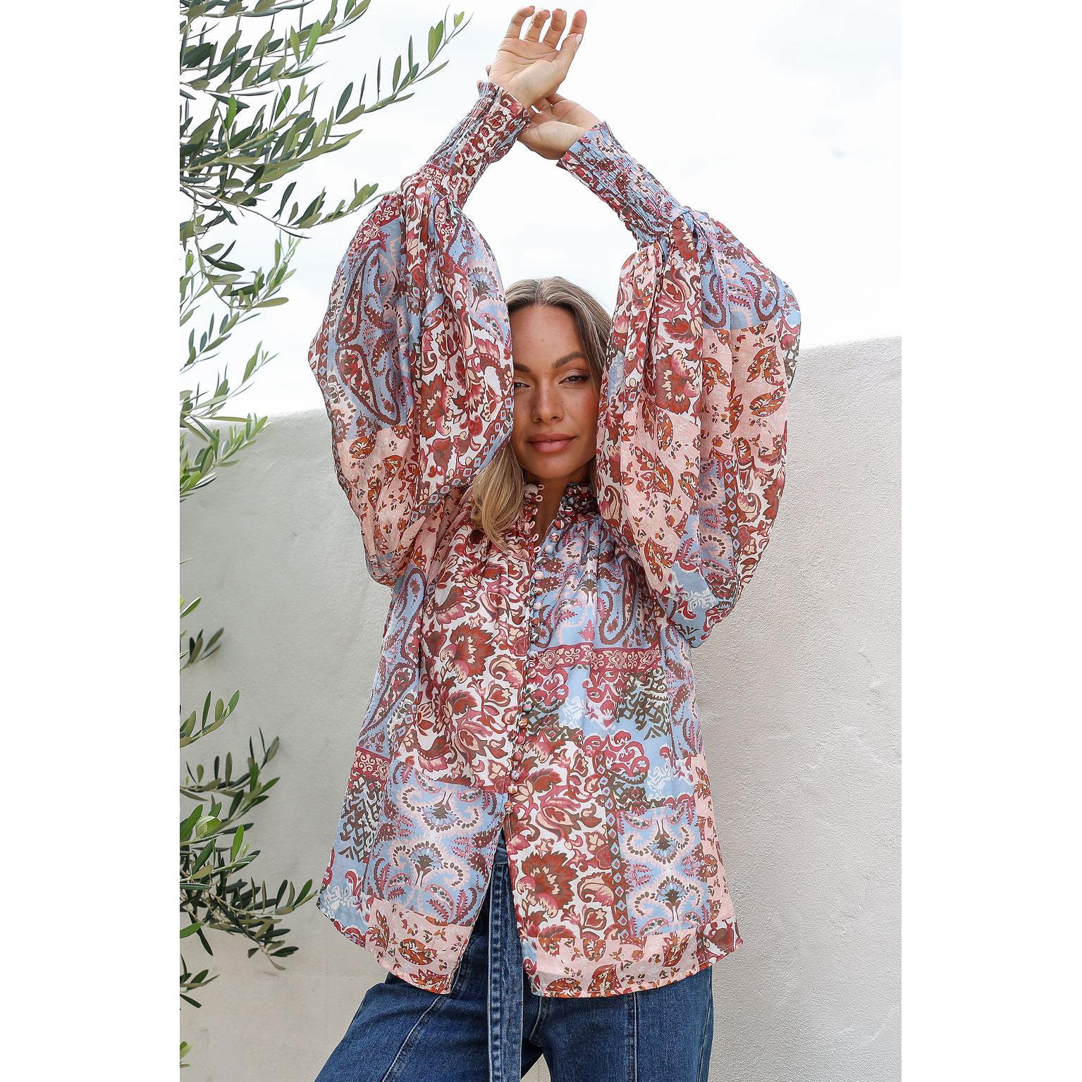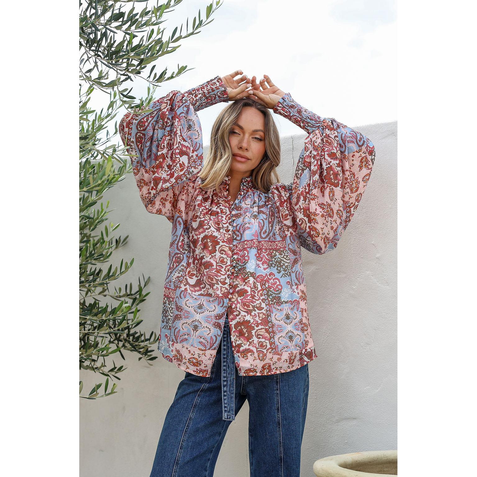 Introducing the Rani Blue shirt—a statement piece that effortlessly combines elegance with comfort. Crafted from a luxurious rayon-nylon blend, this shirt features billowing sleeves with ruched elastic detailing that creates beautiful movement and dimension. The button-through front allows for easy styling versatility, while the refined collar detailing adds a touch of sophistication. Finished with an exquisite print that captures attention, this shirt transitions seamlessly from day to evening wear. Perfect for those seeking a garment that balances dramatic flair with wearable grace.