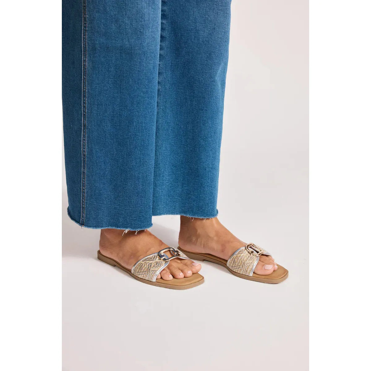 A modern update on the everyday slide. Made from vegan leather with a designer-style metal hardware clasp. Features a cushioned sole for comfort.