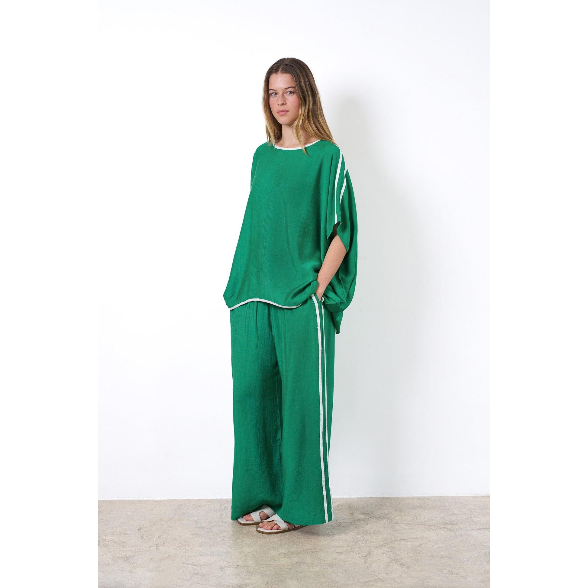 Embrace bold comfort with the Troy Pant in Green. These straight-leg pants feature a loose fit and a stretch elastic waistband with a self-tie adjustable string, ensuring a perfect, effortless silhouette. Side seam pockets add practicality, with a striking contrast bind detail on the side. Crafted from a soft blend of rayon and viscose, they move with you, ready to take on any daring adventure. Wear separately or pair back with our matching Trop top for the perfect on trend look