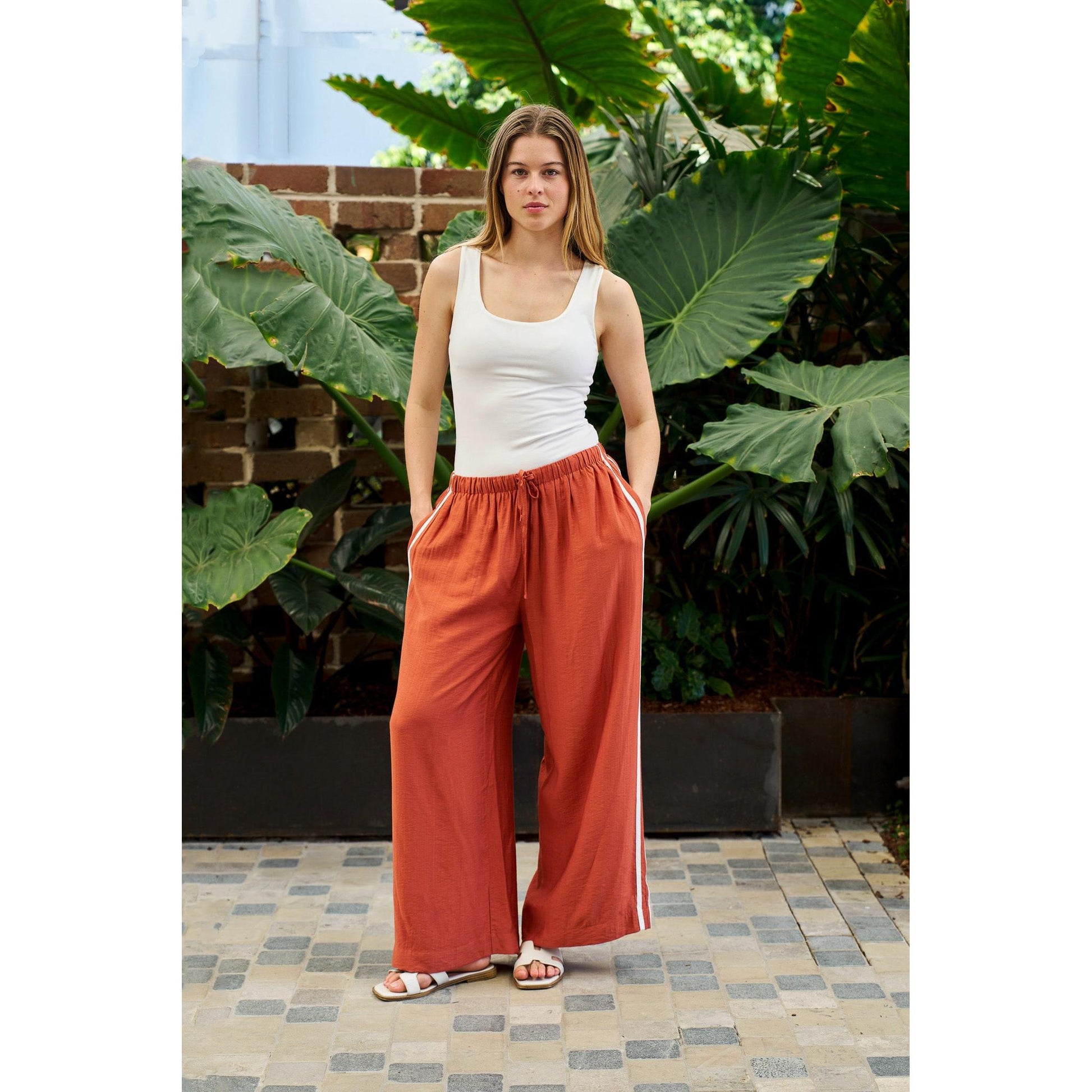 Embrace bold comfort with the Troy Pant in Rust. These straight-leg pants feature a loose fit and a stretch elastic waistband with a self-tie adjustable string, ensuring a perfect, effortless silhouette. Side seam pockets add practicality, with a striking contrast bind detail on the side. Crafted from a soft blend of rayon and viscose, they move with you, ready to take on any daring adventure. Wear separately or pair back with our matching Trop top for the perfect on trend look