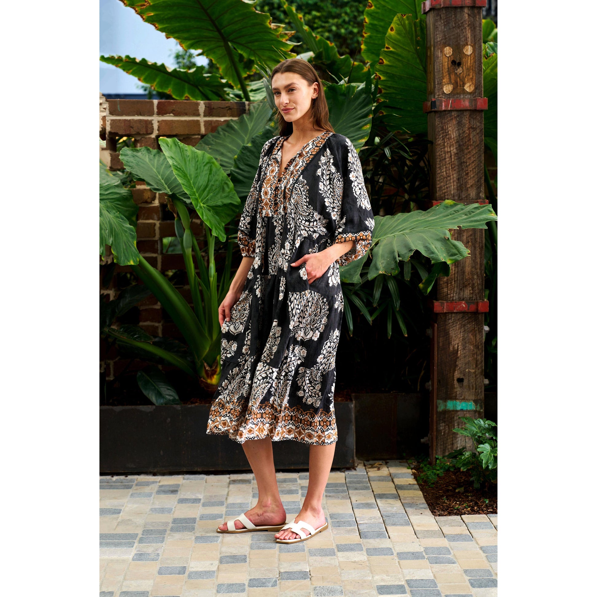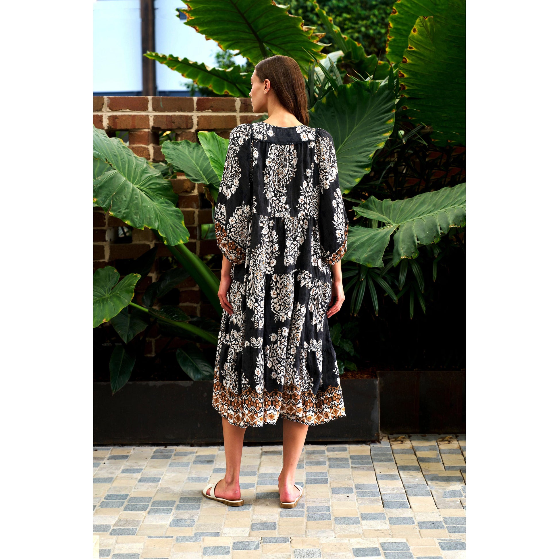 Effortlessly chic and comfortable, the Villa dress in our new Black/Brown print is a fabulous midi dress with its oversized design, v-neckline, and billowing 3/4 sleeves, it's both stylish and comfy. Complete with a button front, hip pockets, and a tiered flounce skirt, this dress also features a unique border print that adds a touch of playfulness.